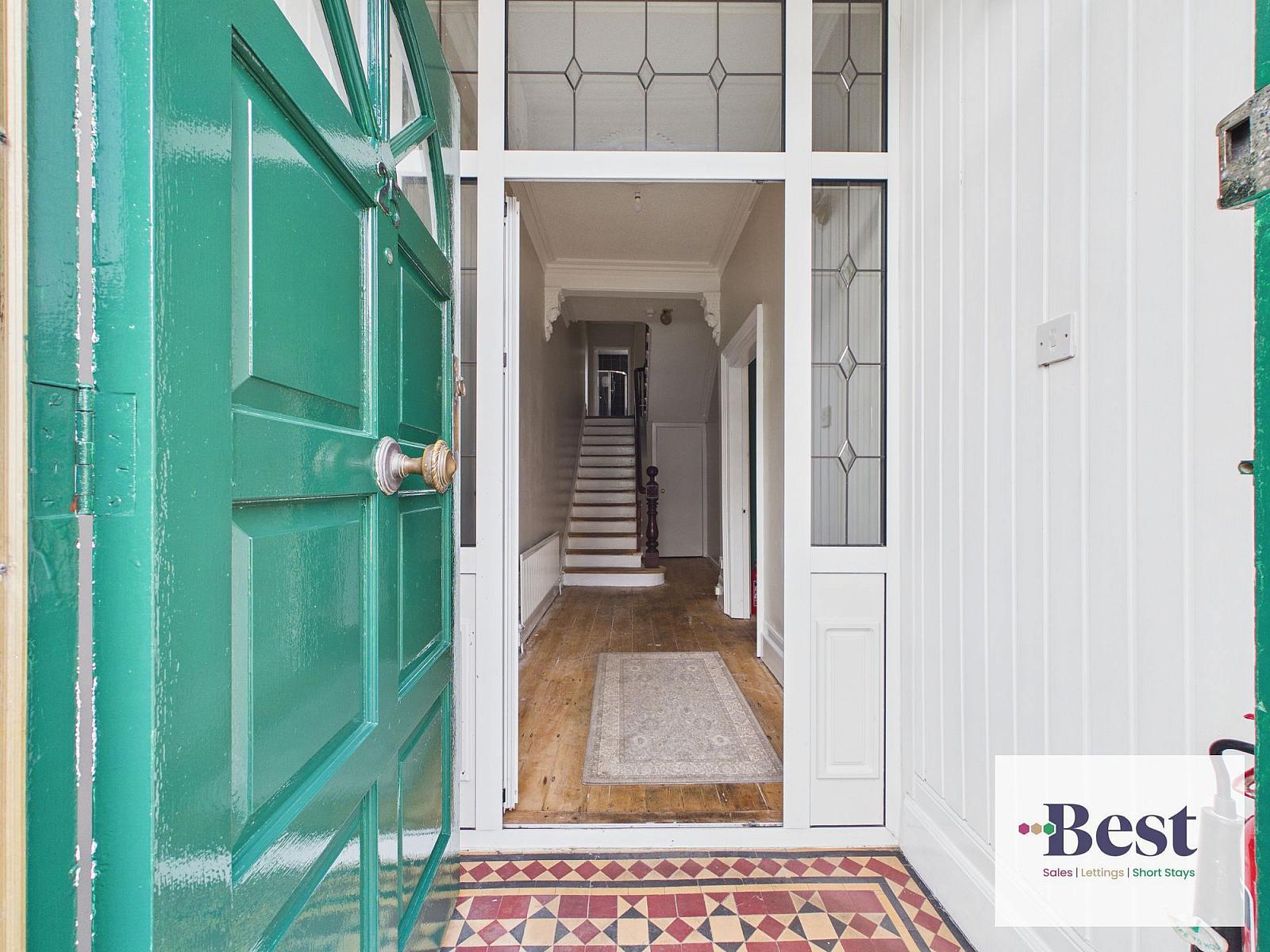 Attractive Panelling. Feature tiled flooring. PVC door with side panels leading to