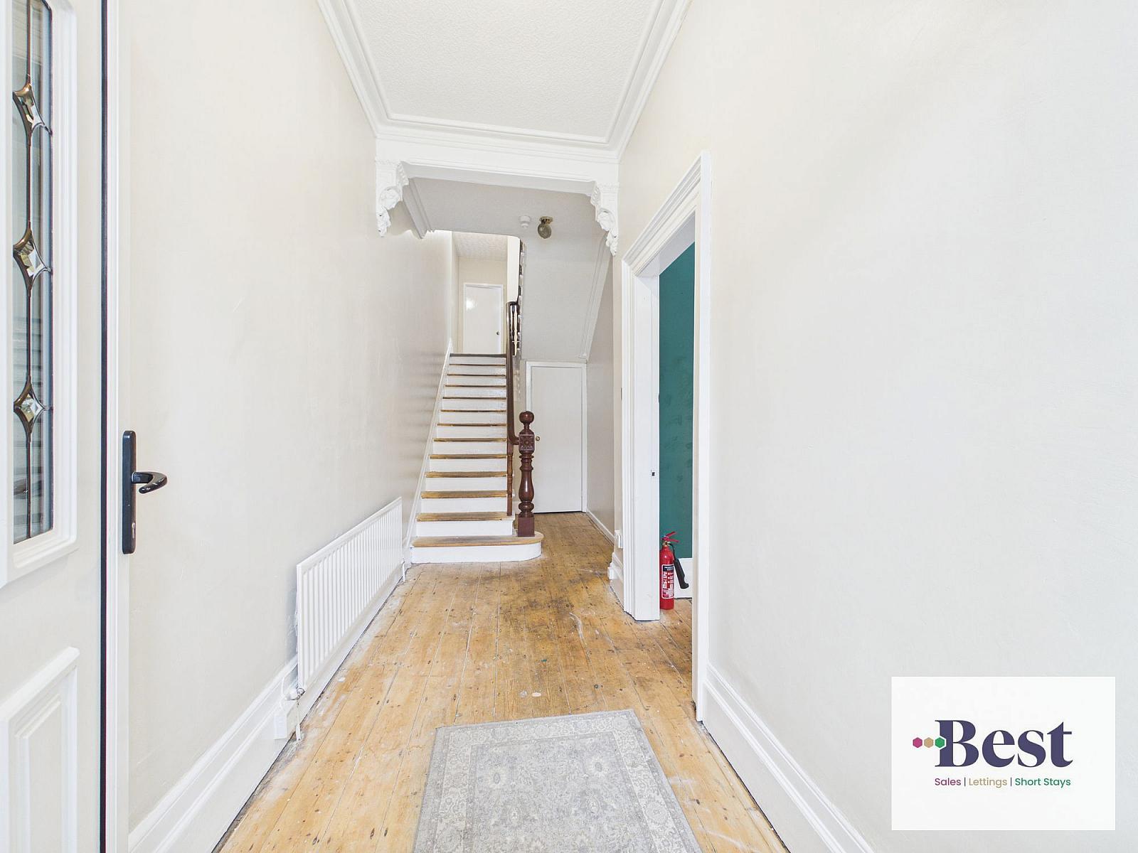 Large bright hallway with original wood flooring and feature staircase