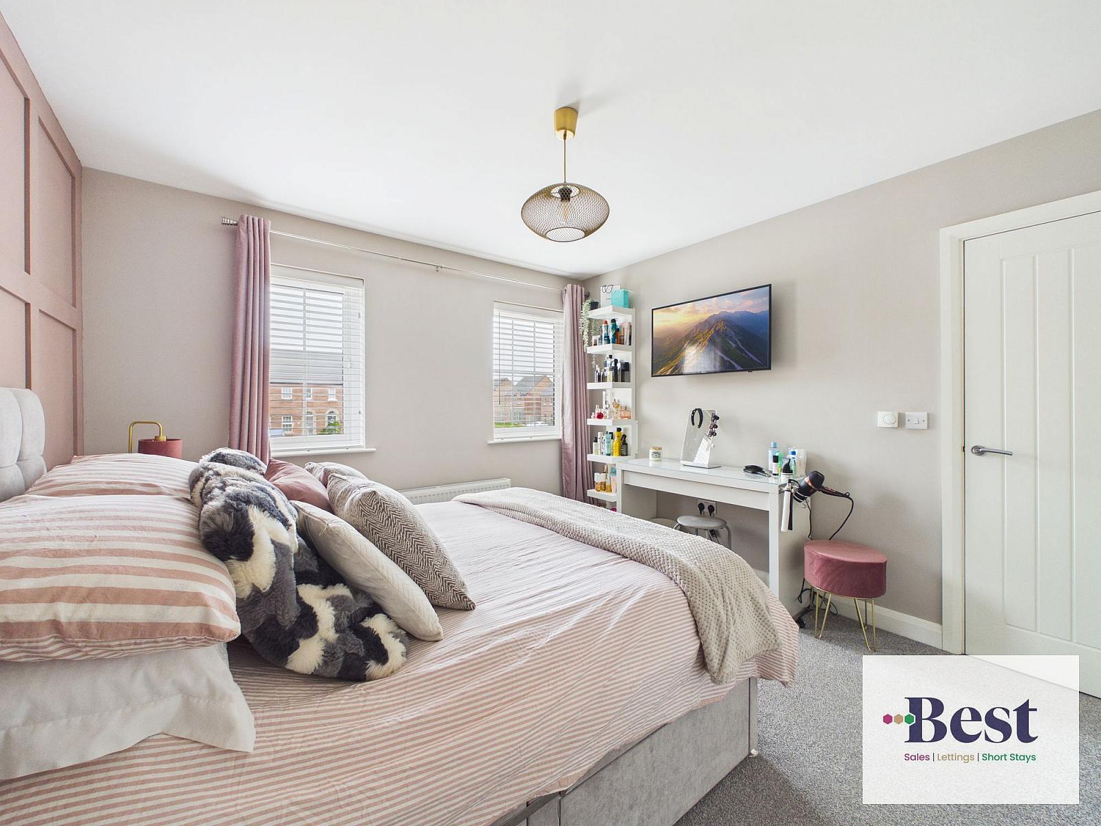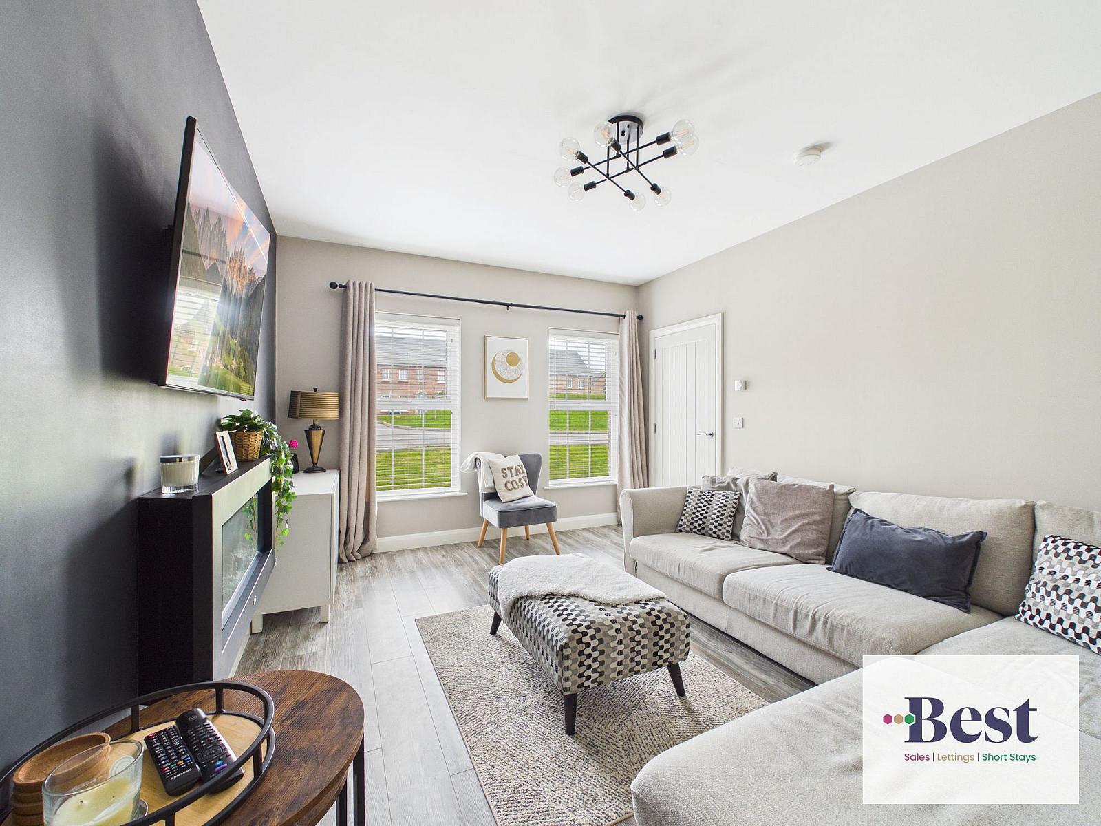 Beautiful room. Feature media style wall with wall mounted electric fire. Dual windows. Laminate wood flooring.