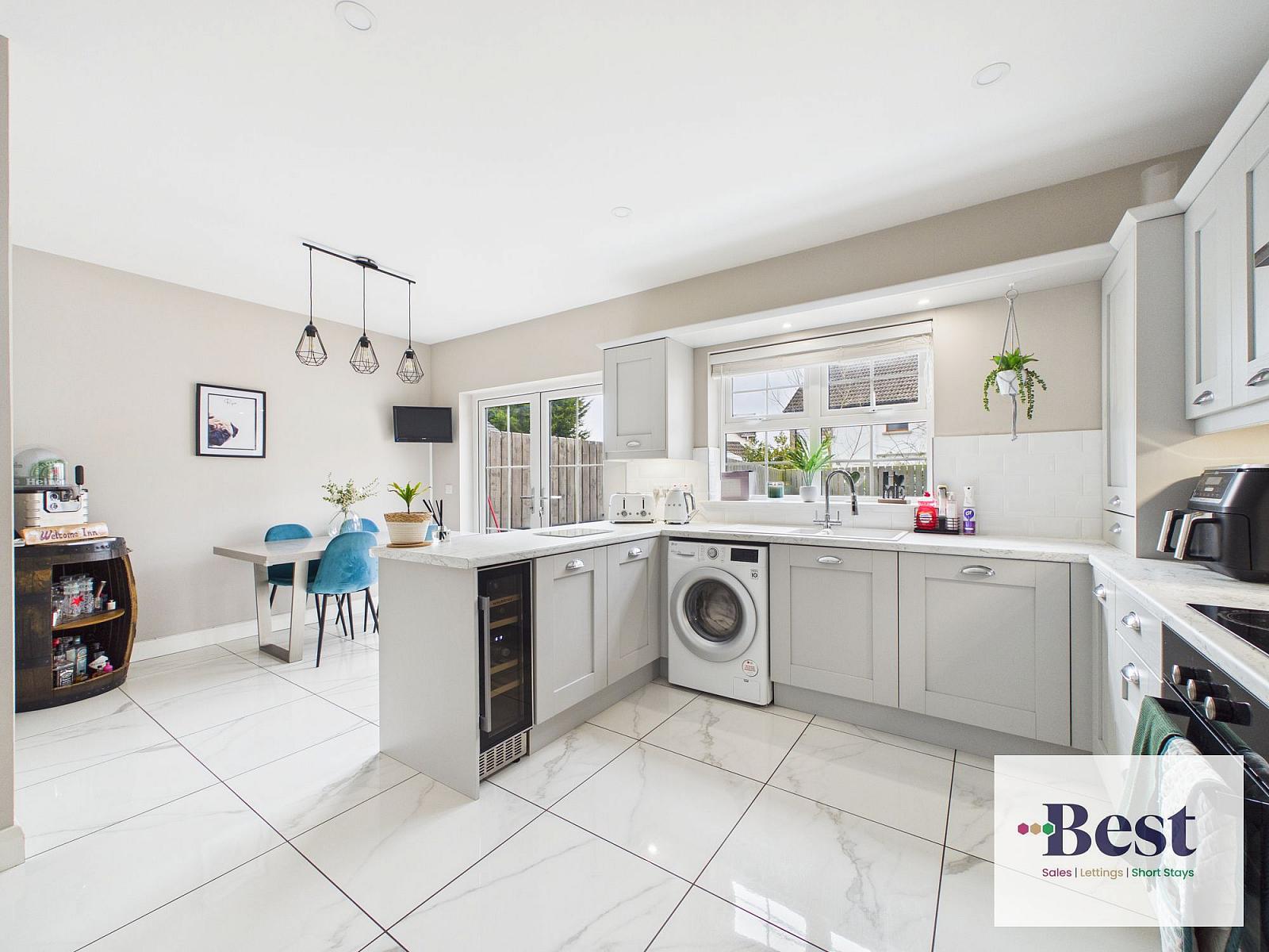 Additional units added to give a u shape breakfast bar with an integrated wine cooler. Four ring hob, under oven, extraction, integrated dishwasher, integrated fridge freezer and space for washing machine. Tiled flooring leading through to Dining area. Ample space for table. French doors to rear garden