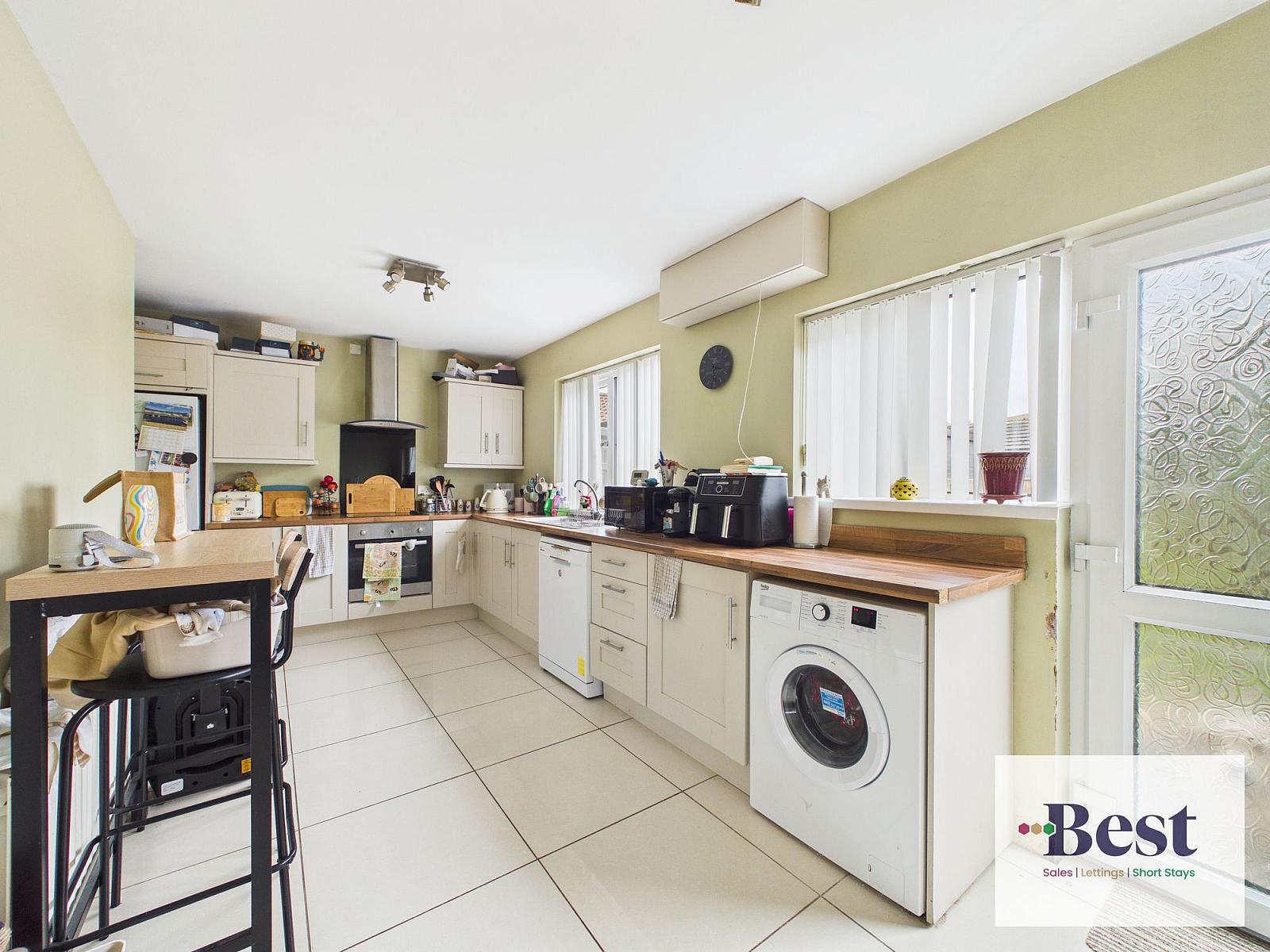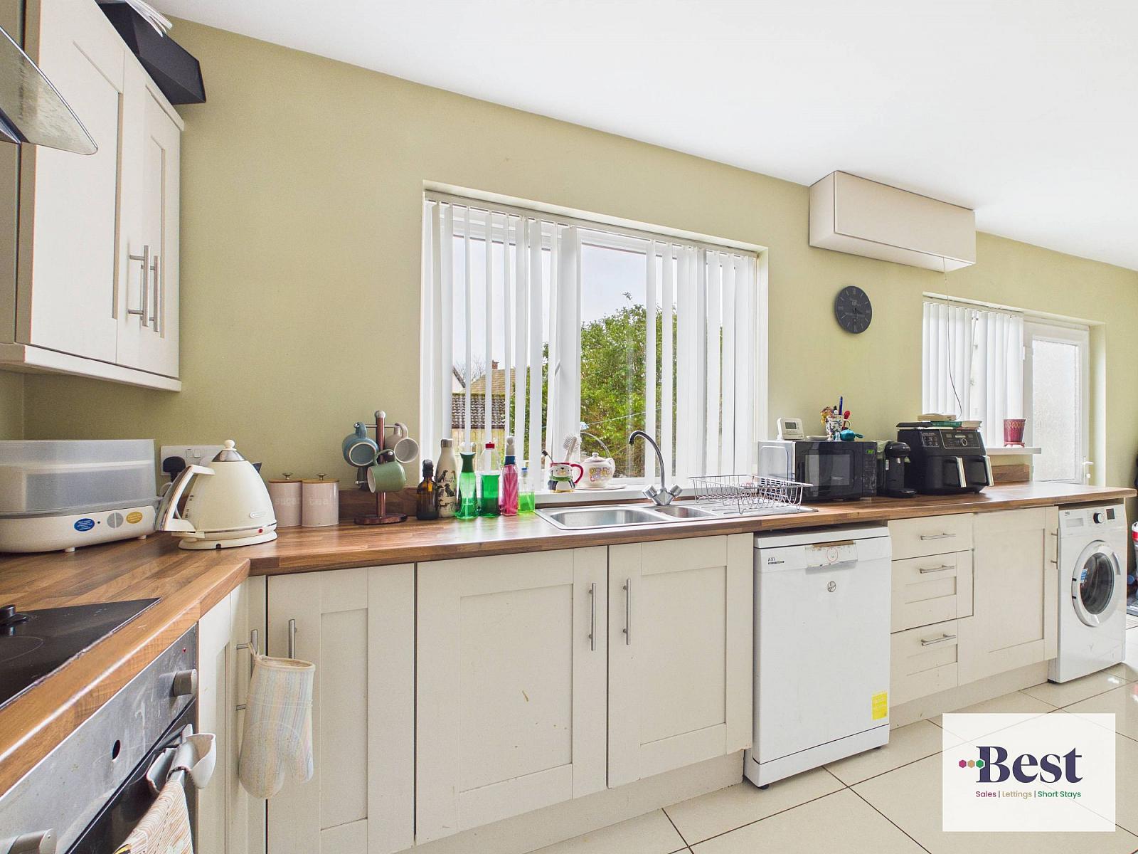 at widest points. excellent range of high and low level cream units with contrast wood block work surfaces. Four ring hob, built in under oven and extraction. Space for fridge freezer, space and plumbed for appliances. Ample space for Dining. Tiled flooring. Under stairs storage.