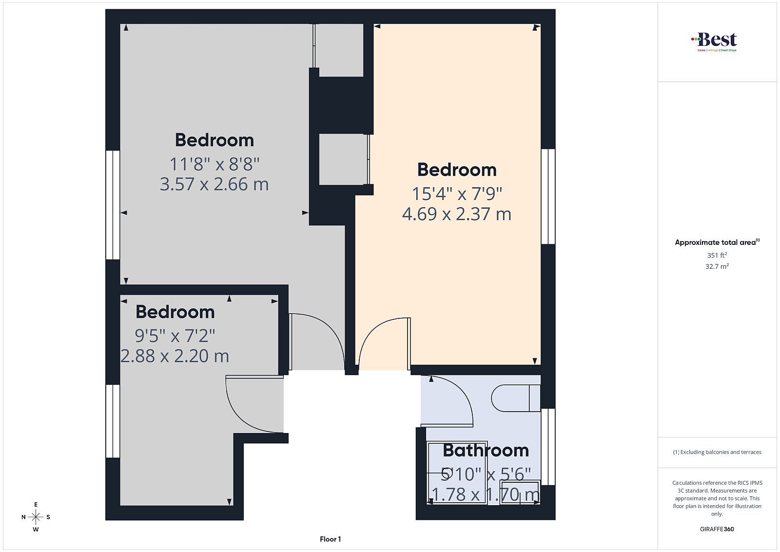 Bedroom 1 w: 4.69m x l: 2.6m (w: 15' 5" x l: 8' 6")