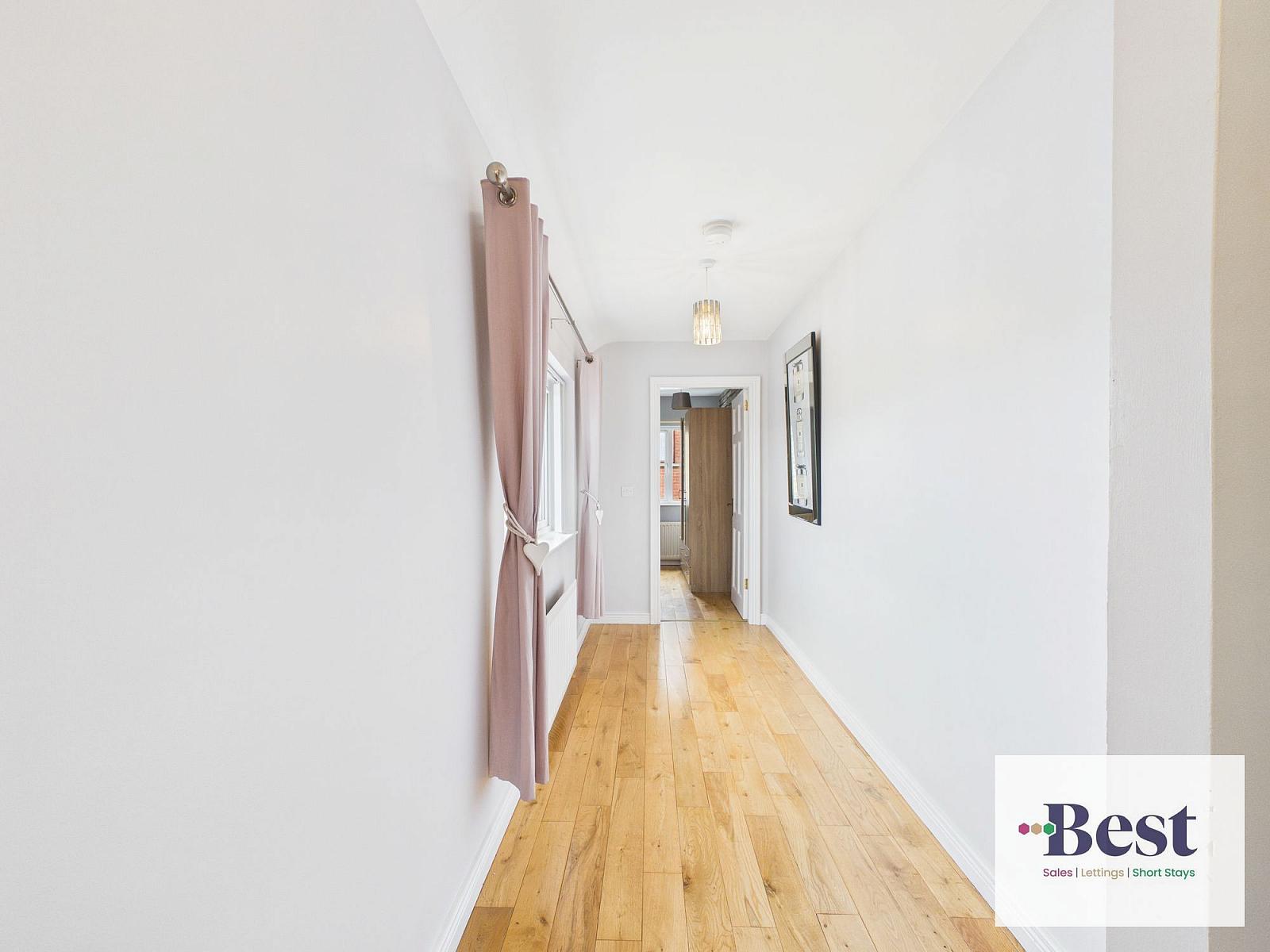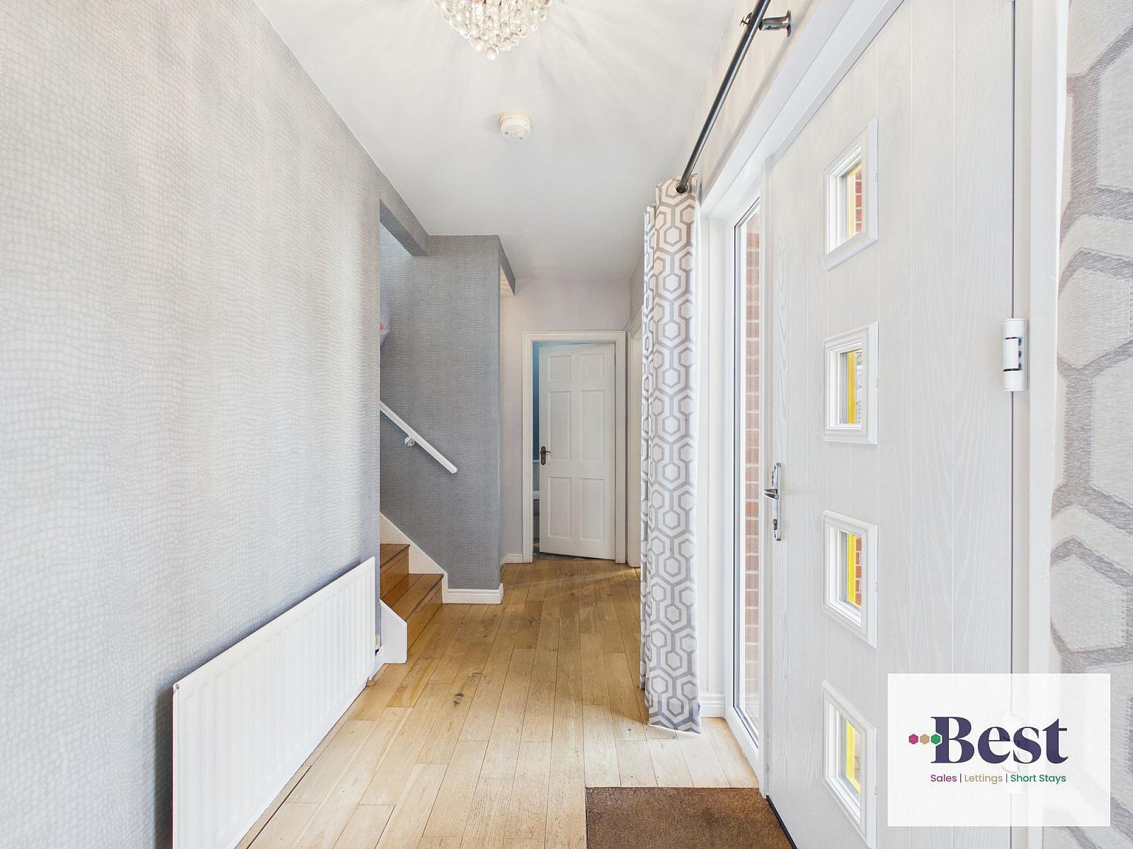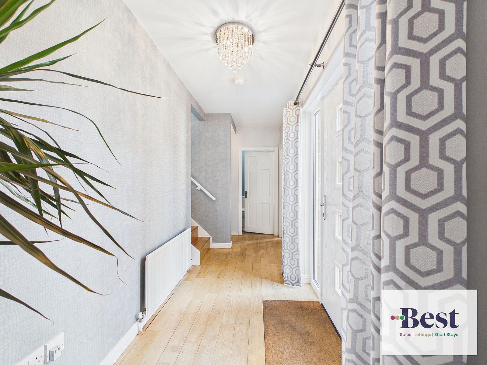 Striking feature composite front door opening to a beautiful bright and elegant entrance hall with floor to ceiling windows. Solid wood flooring.