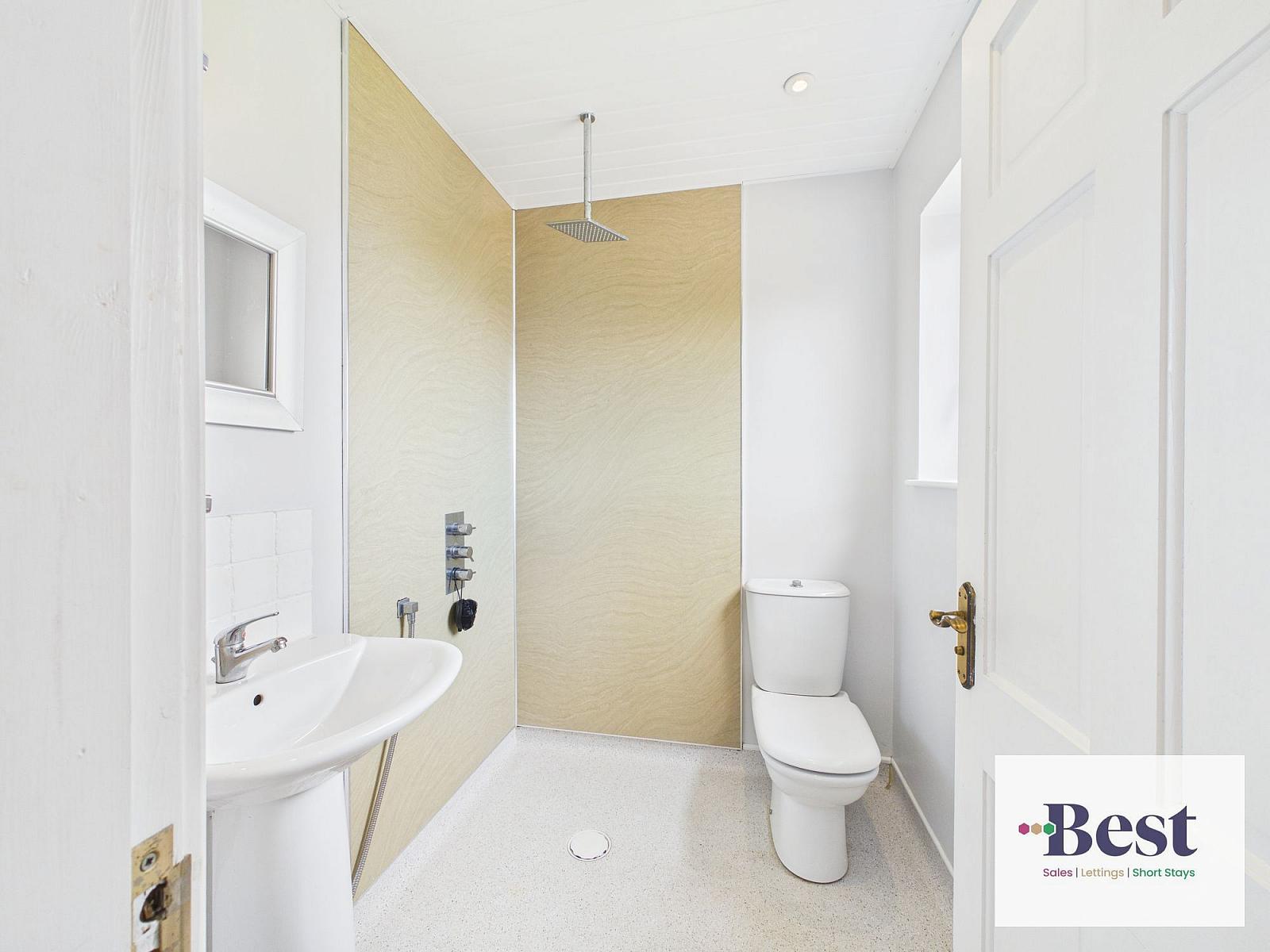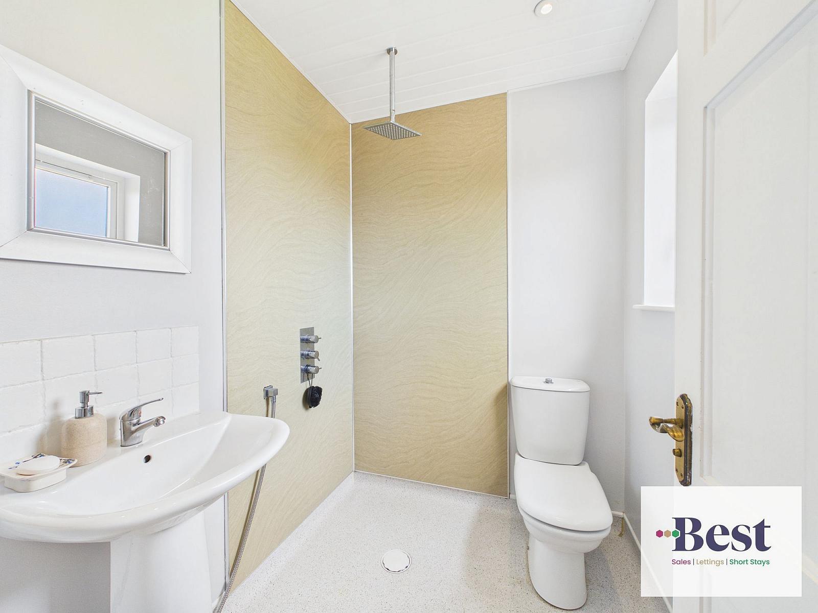 Modern wet room with low flush WC, pedestal wash hand basin and thermostatically controlled rain shower.