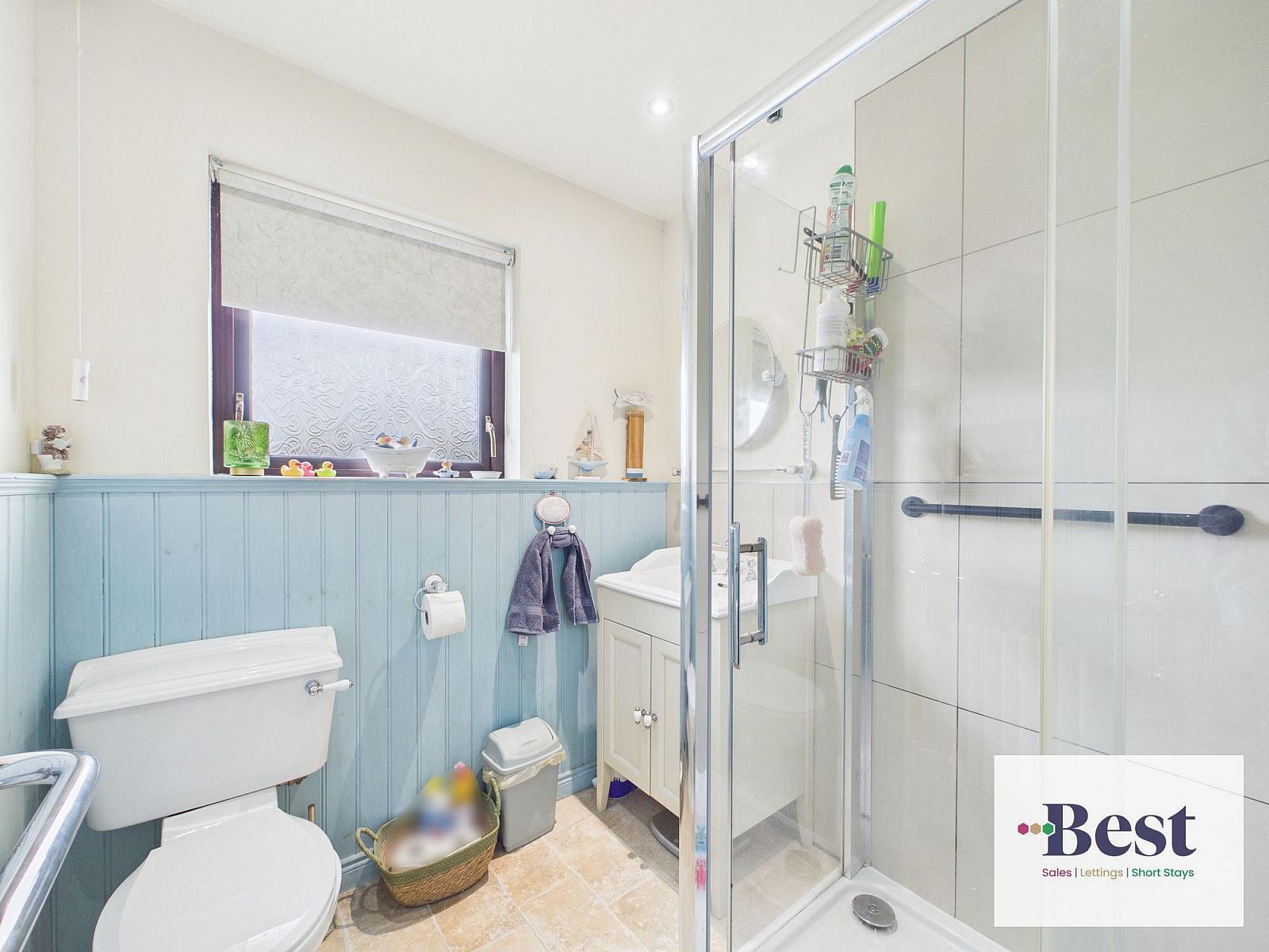 Bright bathroom. White suite comprising of low flush WC, heritage vanity unit with stainless steel taps. Large shower enclosure with electric shower and tiled walls. Tile effect flooring with half panelled / half tiled walls.