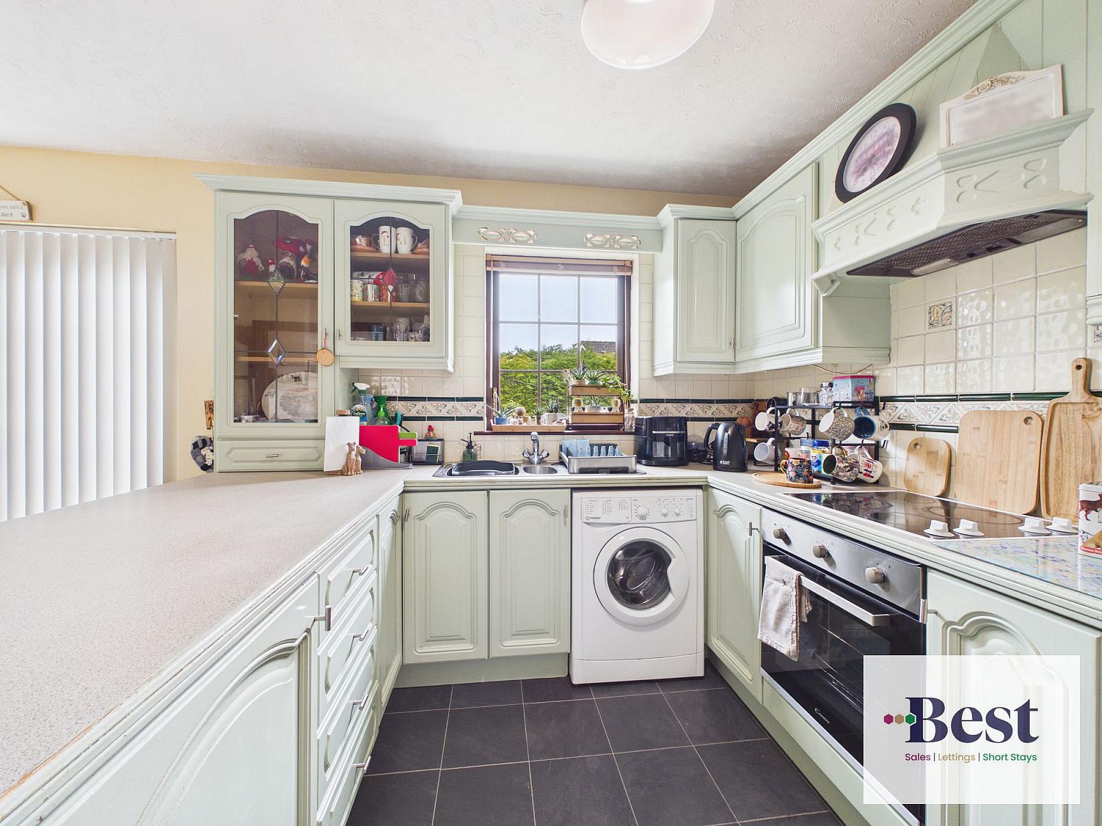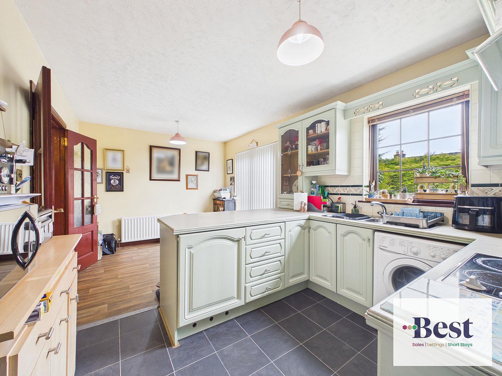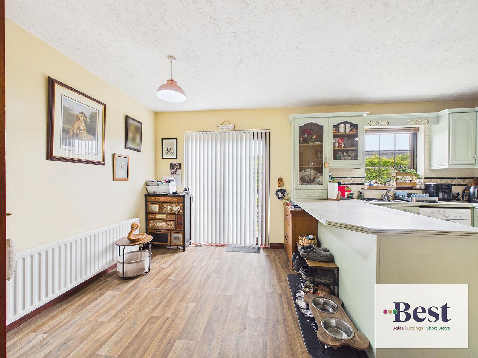 Good range of high and low level units. Features a breakfast bar, integrated electric oven with 4-ring electric hob, built in fridge and space for a washer / dryer. Tiled flooring. Side door giving access to integral garage.