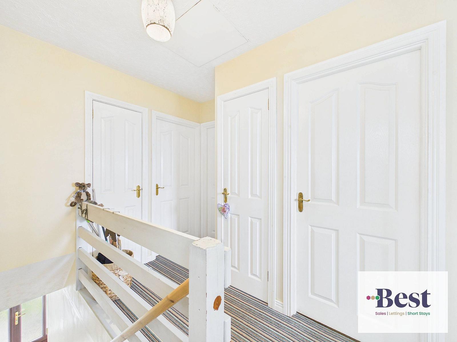 Good sized single room with wood effect flooring and integrated storage cupboard above stair box.