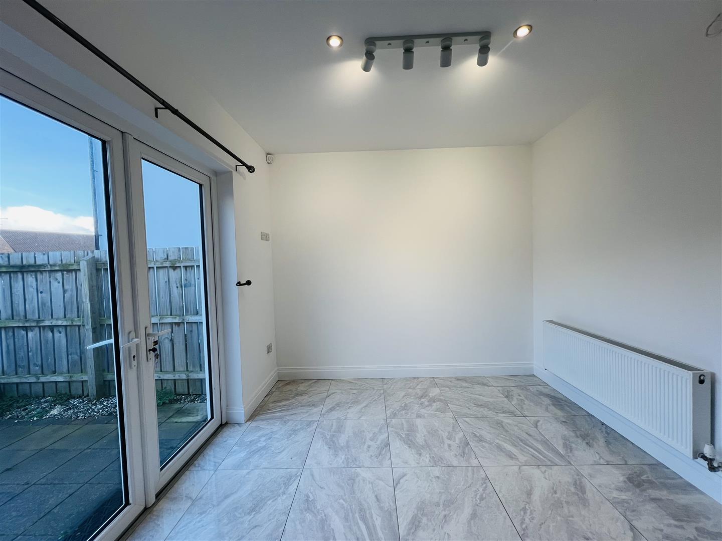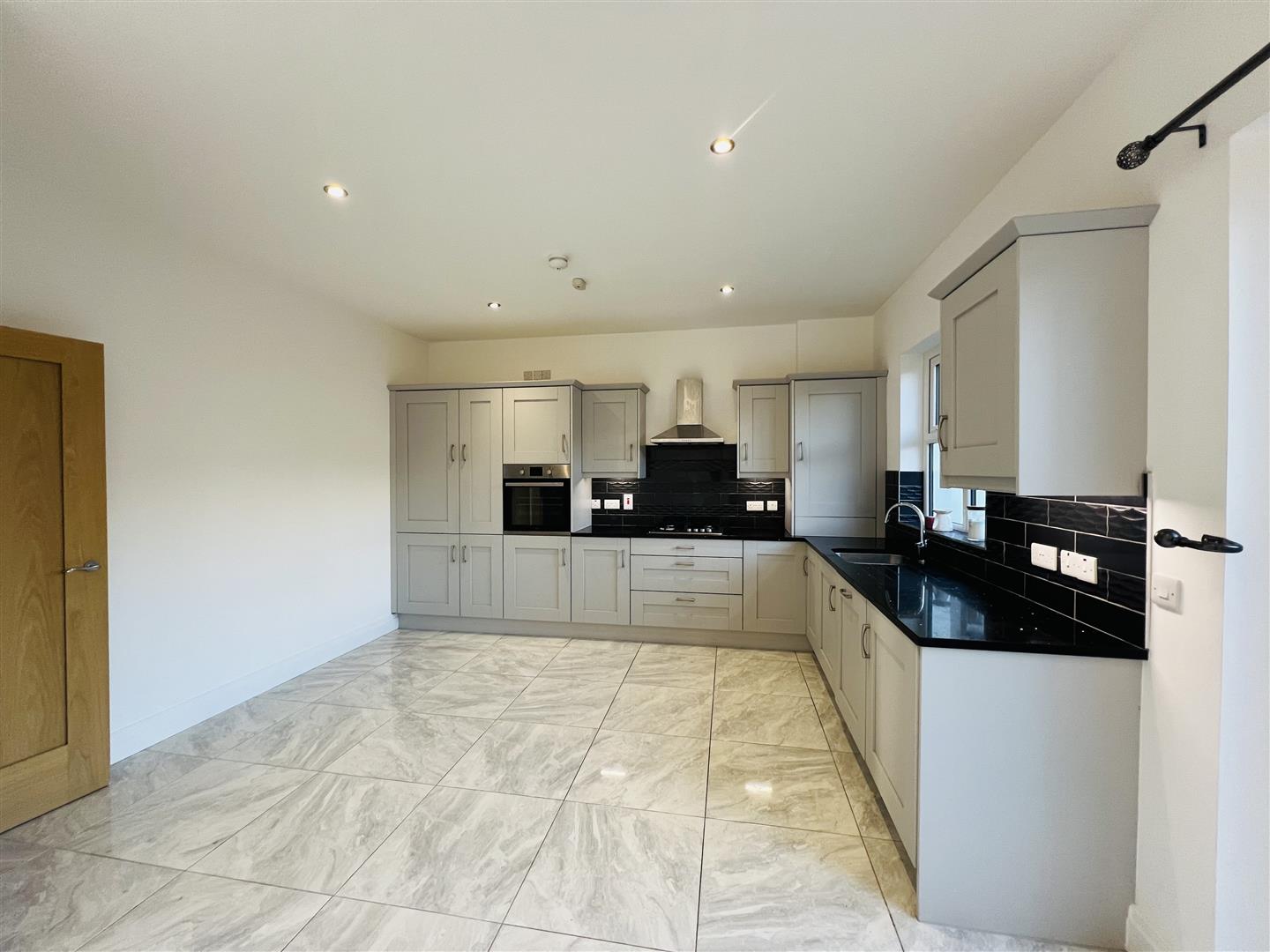 Having excellent range of eye and low level units, tiling between units, 1 1/2 bowl stainless steel sink unit set in Quartz worktop, gas hob, electric oven, stainless steel extractor hood, integrated fridge / freezer, dishwasher and washing machine, recessed lighting, tiled floor, spacious dining with French doors leading to rear.