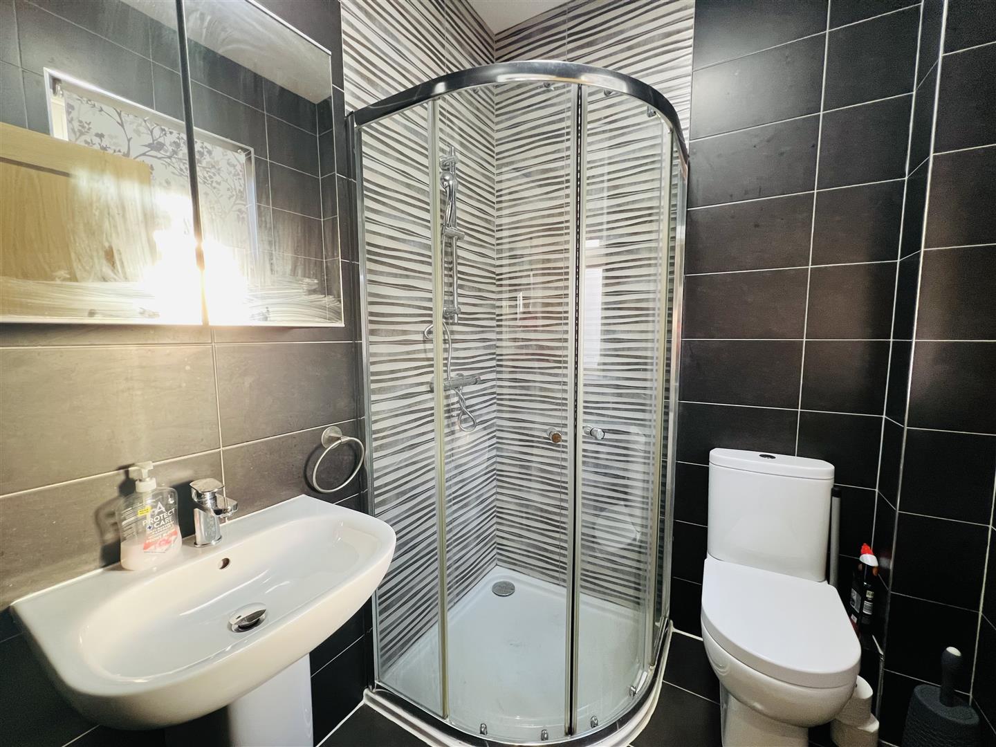 Comprising walk in shower, whb and wc, fully porcelain tiled walls and tiled floor.