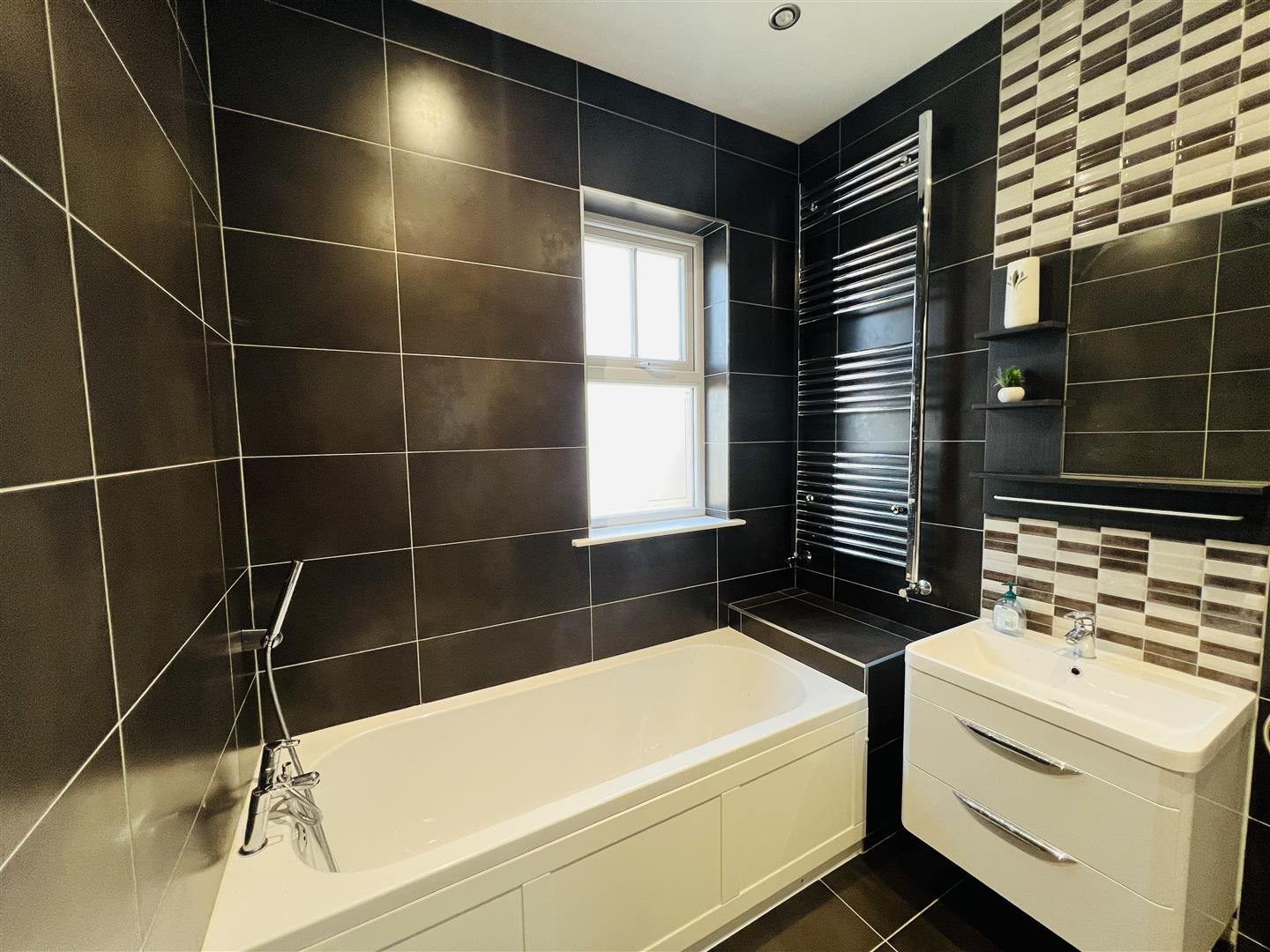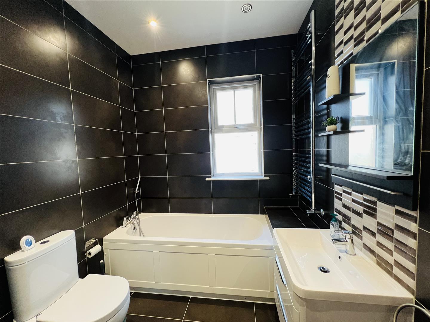 Comprising bath with shower fitting to taps, walk in electric shower, whb set in vanity unit, wc, recessed lighting, fully porcelain tiled walls, tiled floor.