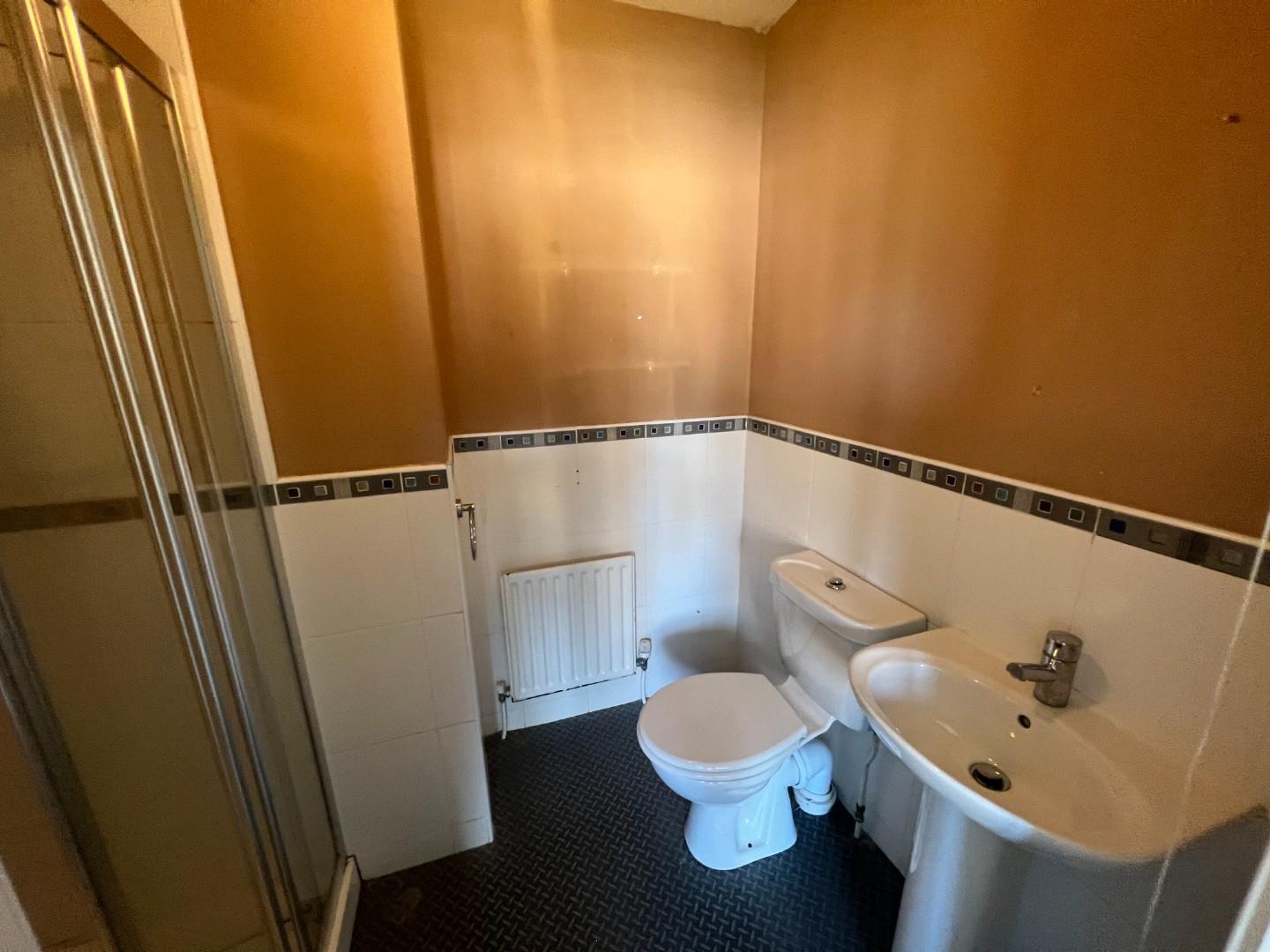A white suite with LFWC, pedestal wash hand basin and a shower fully tiled with an electric shower and glass folding door. Extractor, Linoleum flooring.