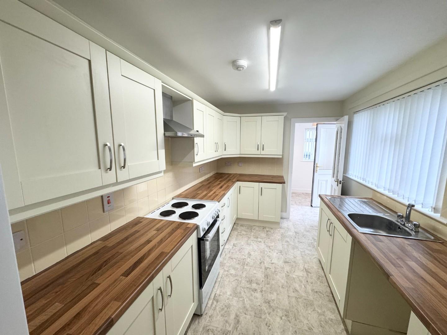 Modern wood effect kitchen with high and low level units , stainless steel sink and drainer, electric cooker with stainless steel extractor above, Fridge freezer, plumbed for washing machine, new thick linoleum on floor.