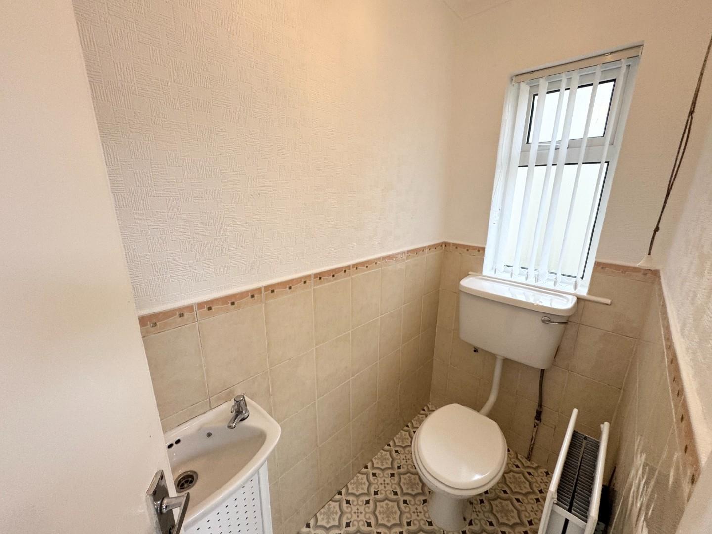 Downstairs toilet with LFWC, wash hand basin, part tiled wall, Linoleum floor, rear porch to concrete enclosed yard.