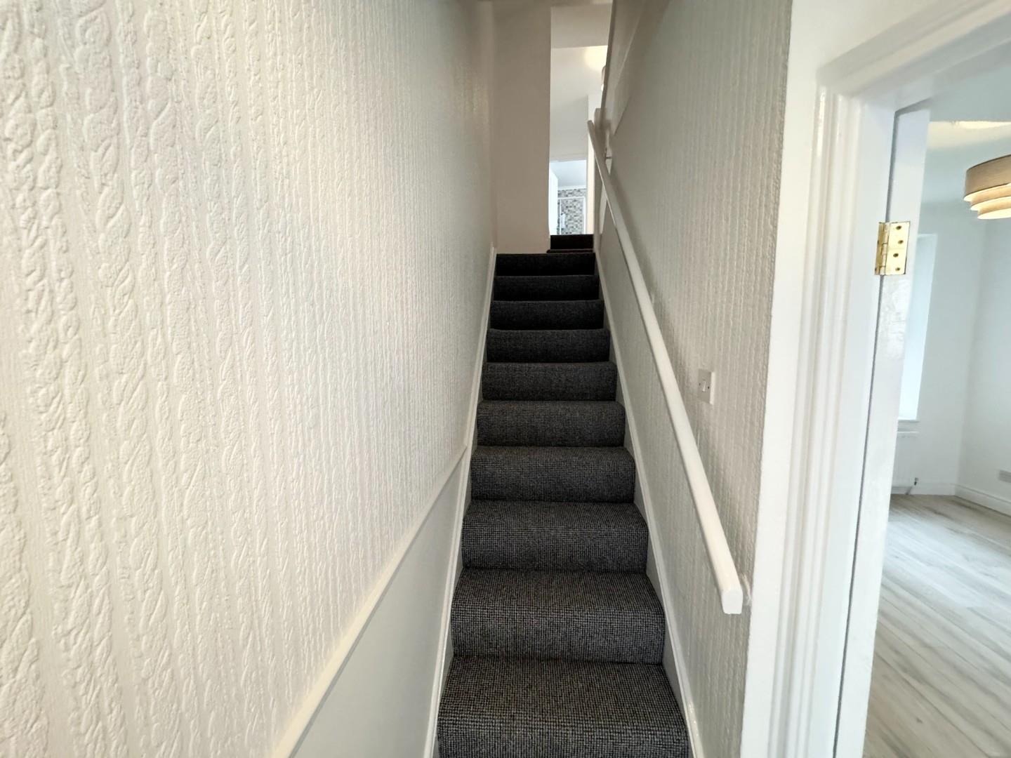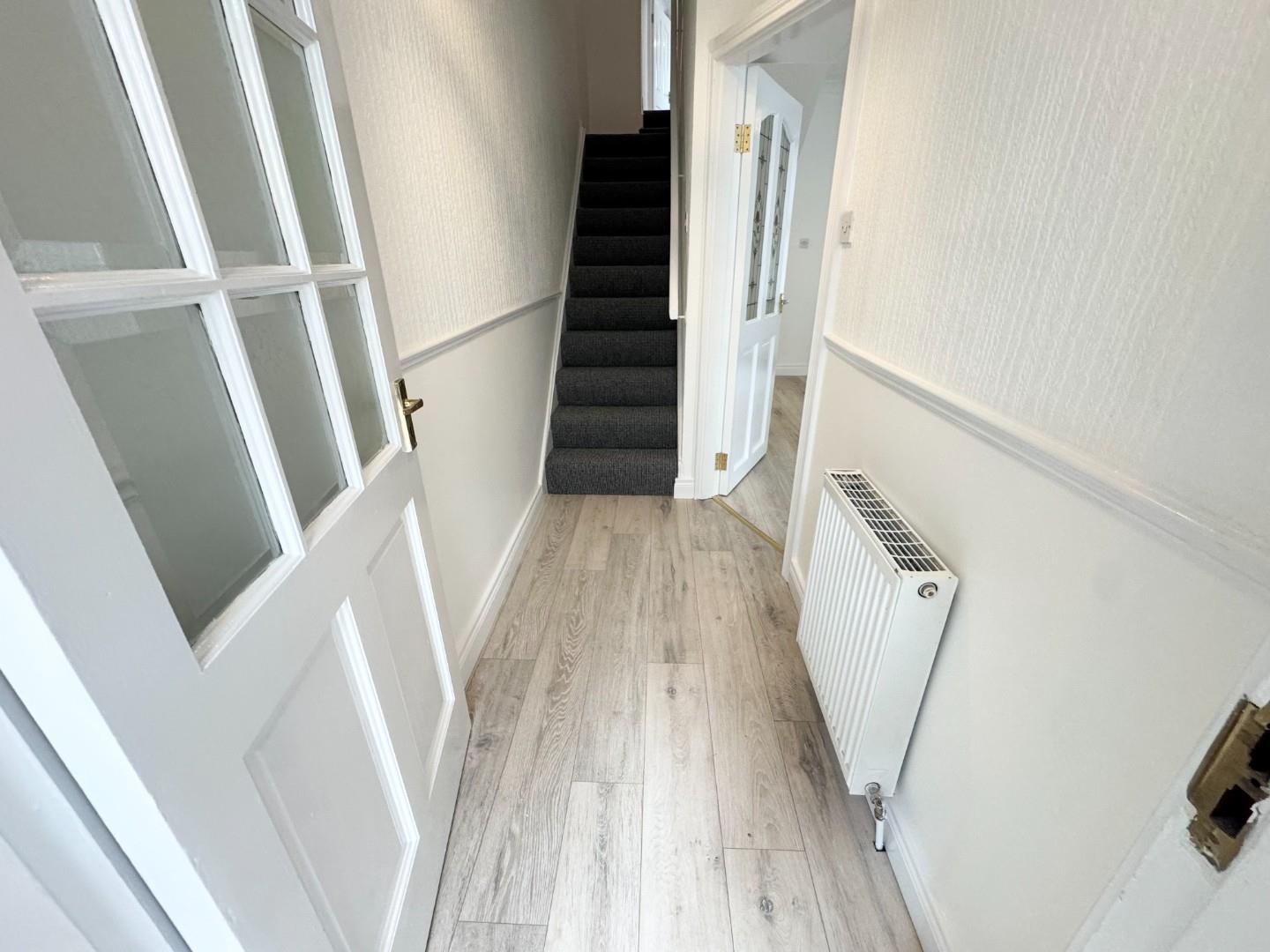 Bright hallway with laminate flooring. Leading to stairs with new carpet.