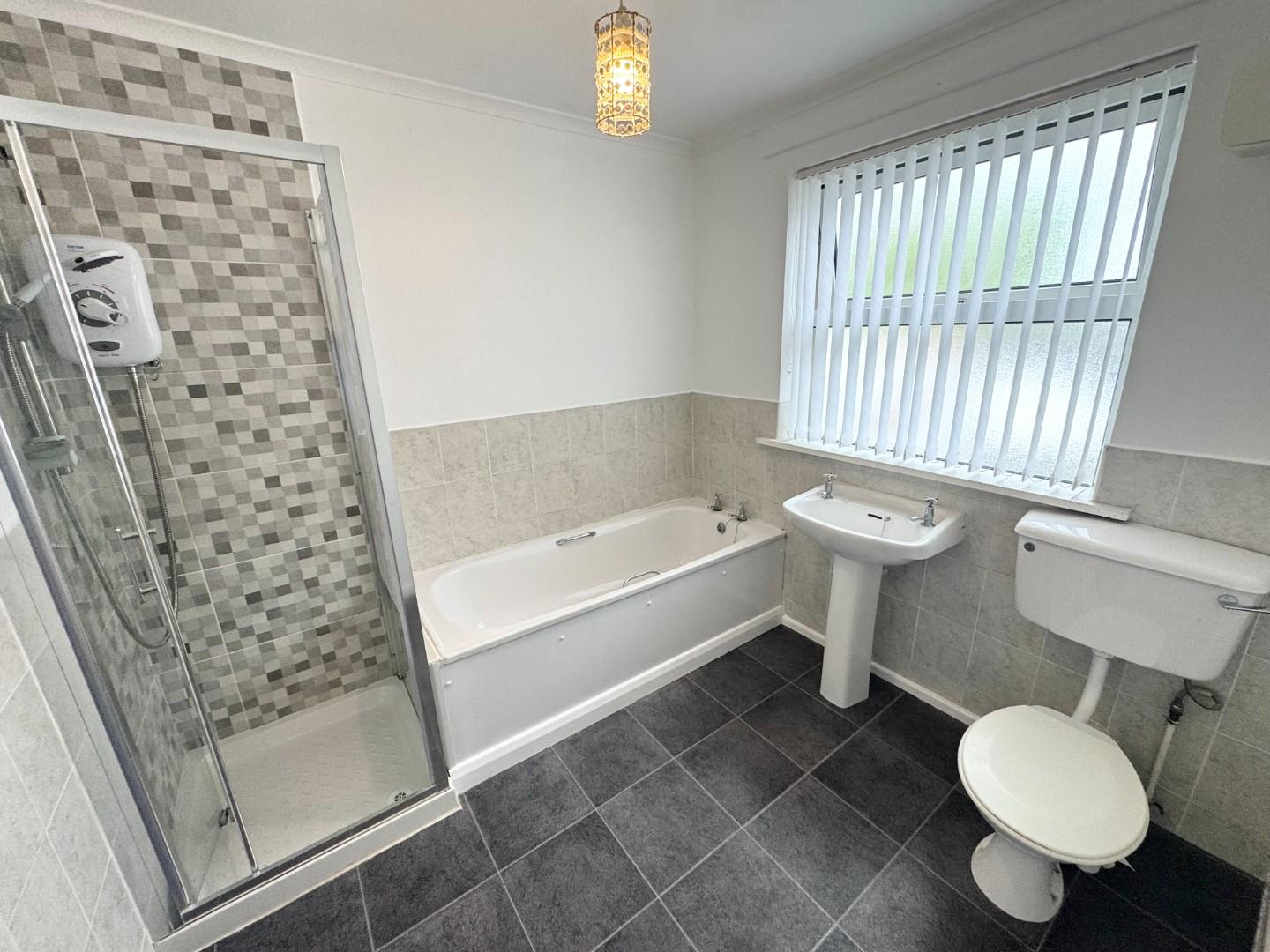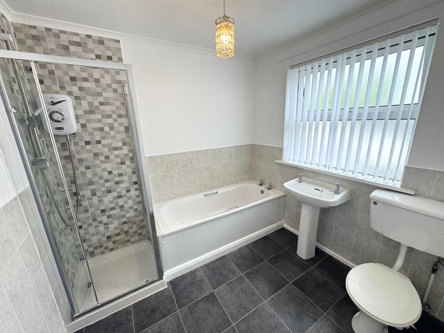 White suite comprising, LFWC, pedestal wash hand basin, new electric shower set in a tiled cubicle with glass door, panel bath, part tiled wall and linoleum floor.