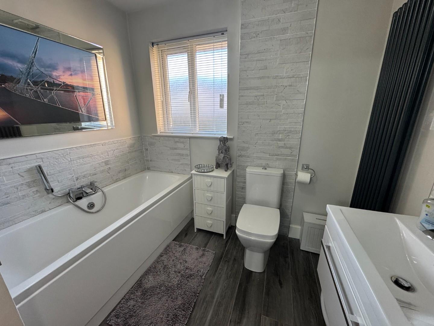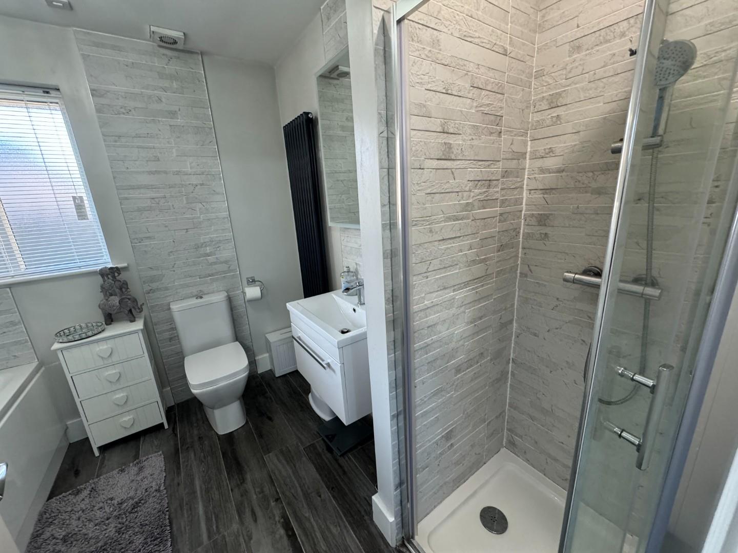 New white suite comprising, LFWC, wash hand basin and storage , panel bath with shower attachment and separate shower with power shower fully tiled and glass folding door, extractor.