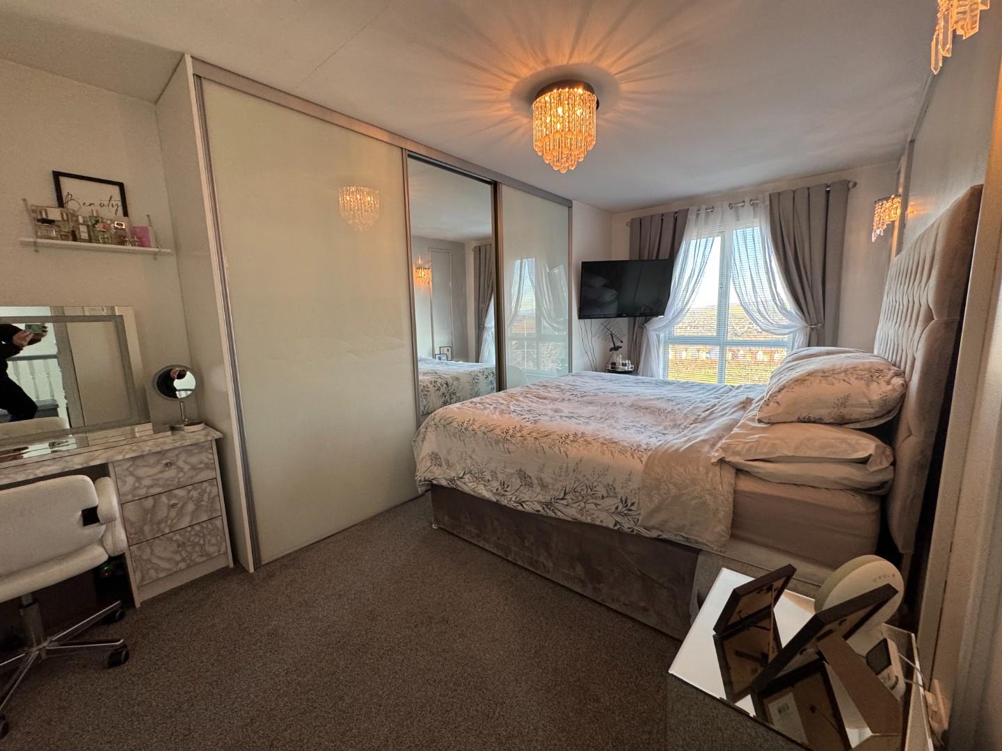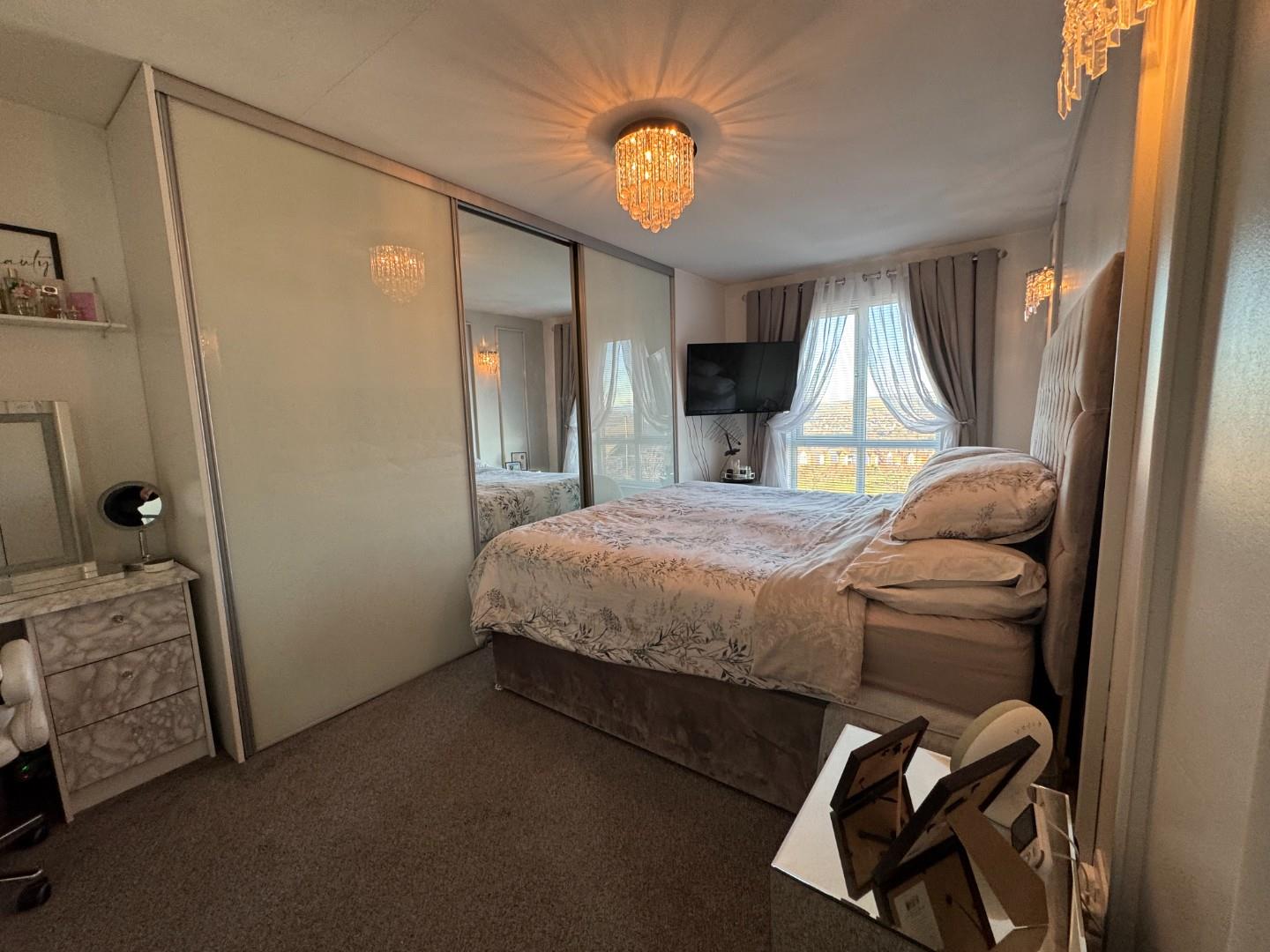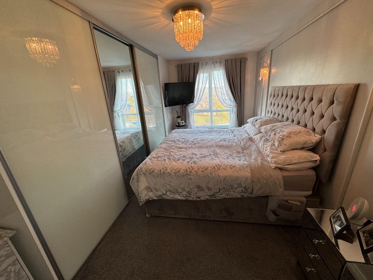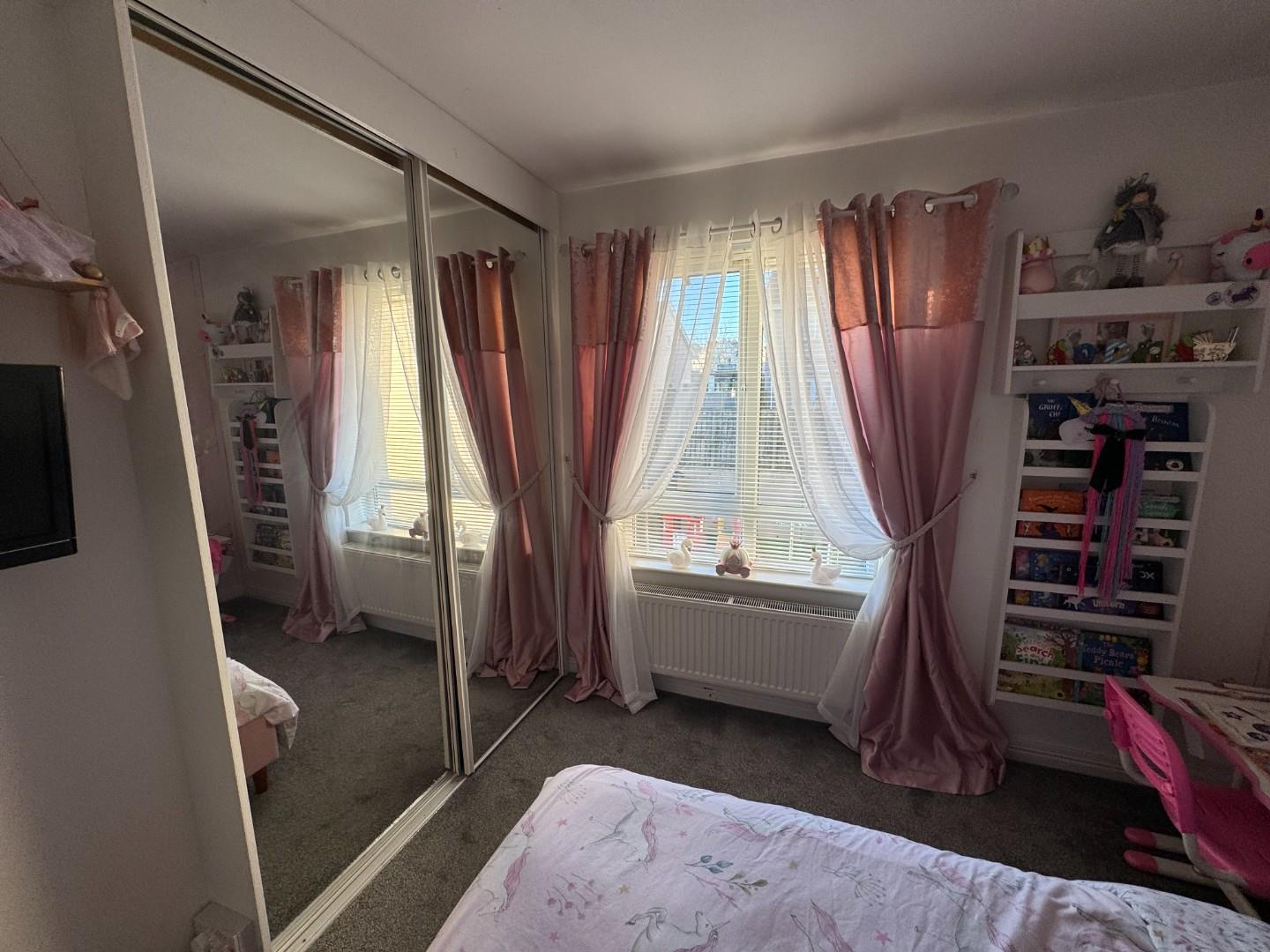 Double room with carpet flooring and mirrored slide robes.