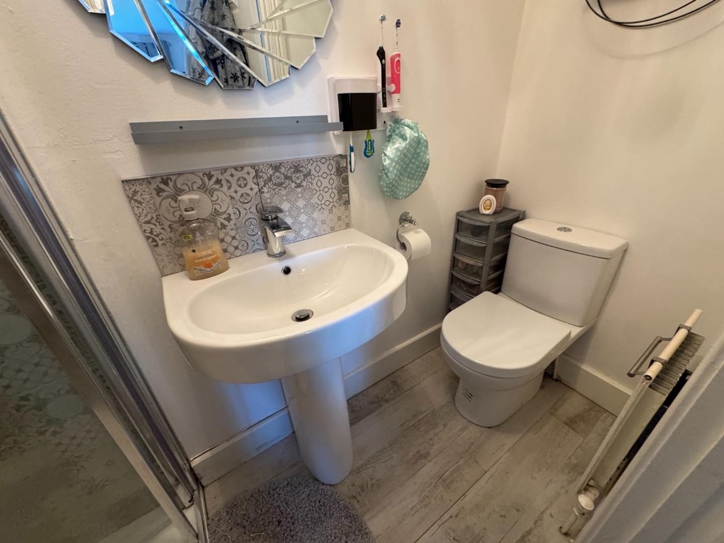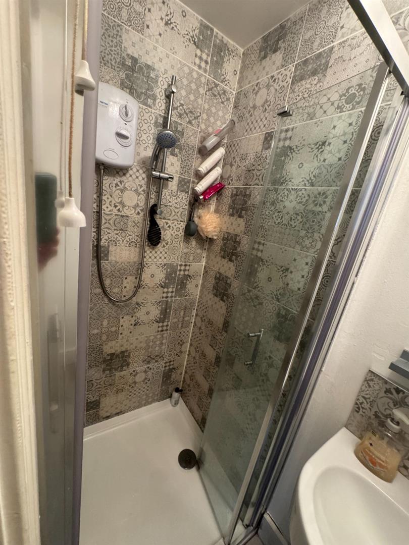 White suite with LFWC, pedestal wash hand basin, shower unit fully tiled with electric shower and glass folding door, extractor, fully tiled floor and part tiled walls.