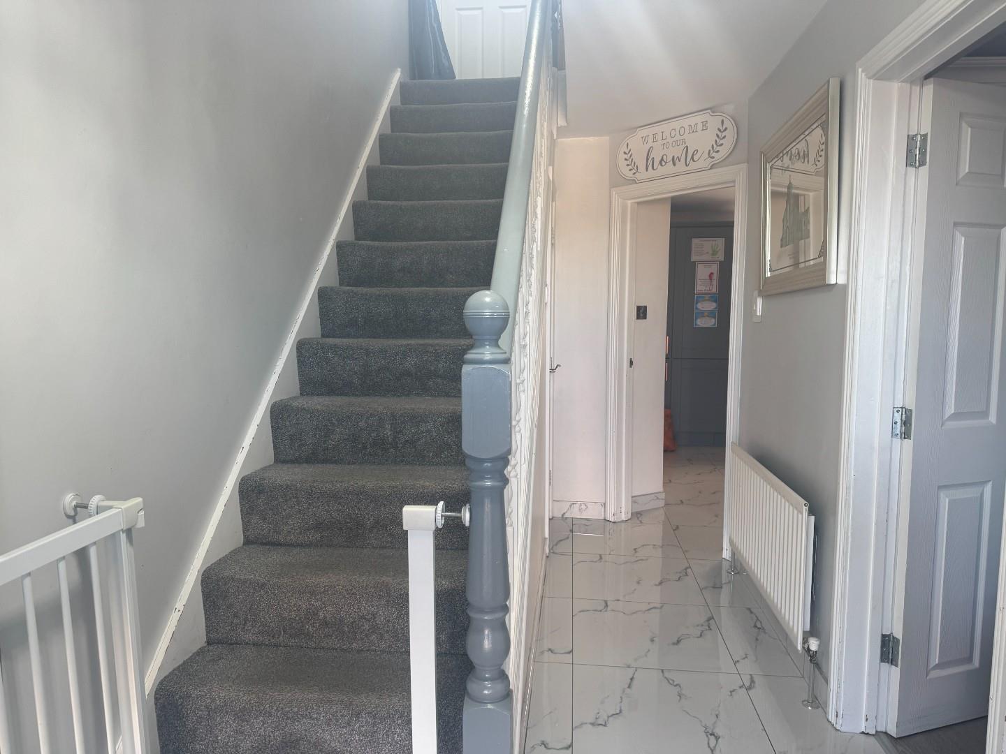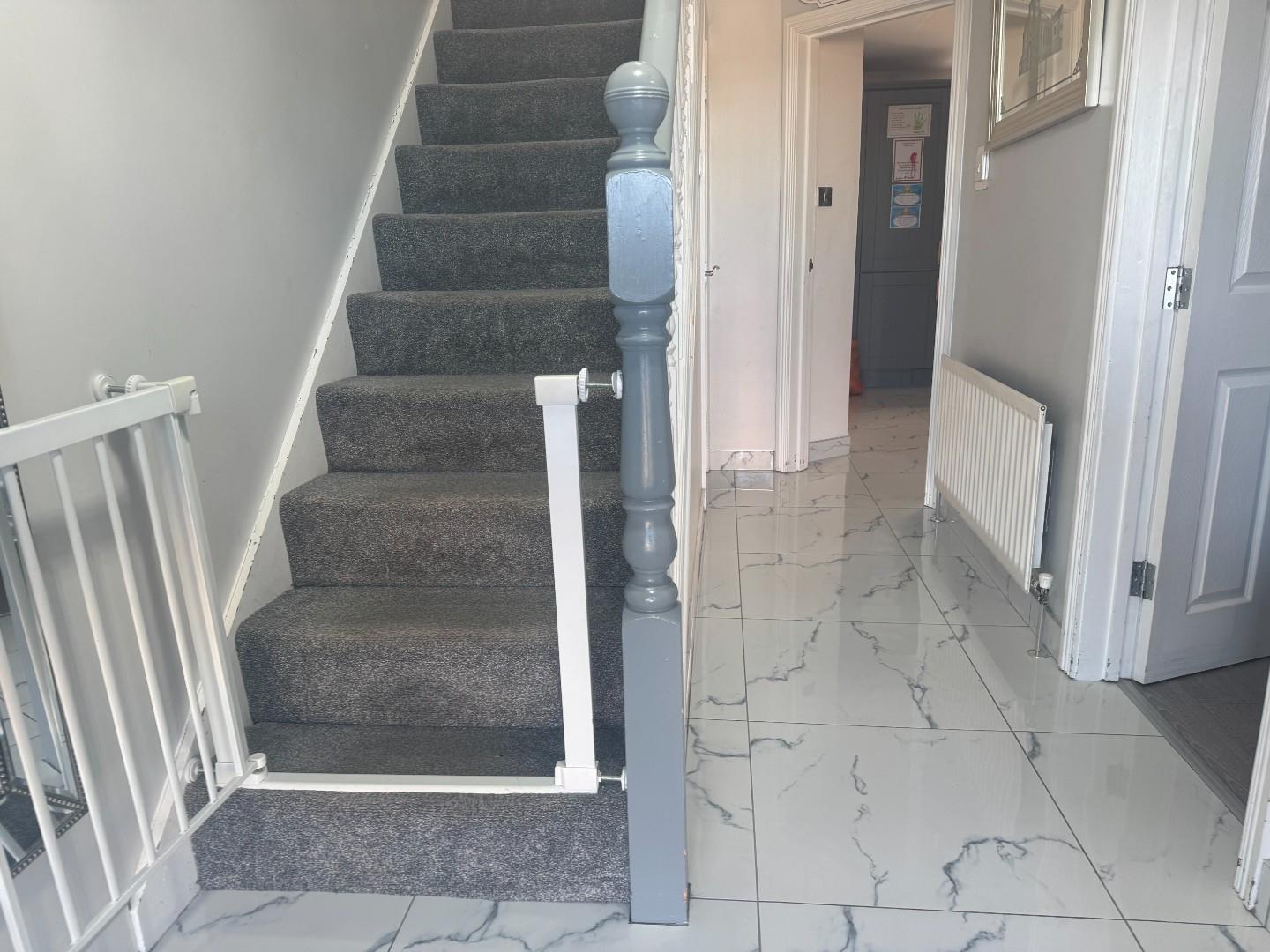 Composite PVC front door to bright hallway fully tiled.