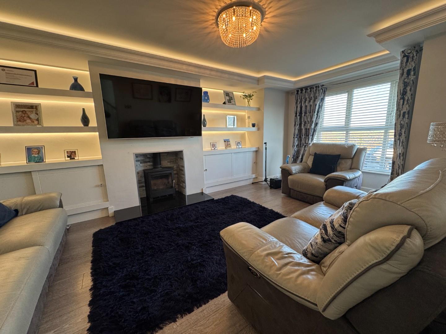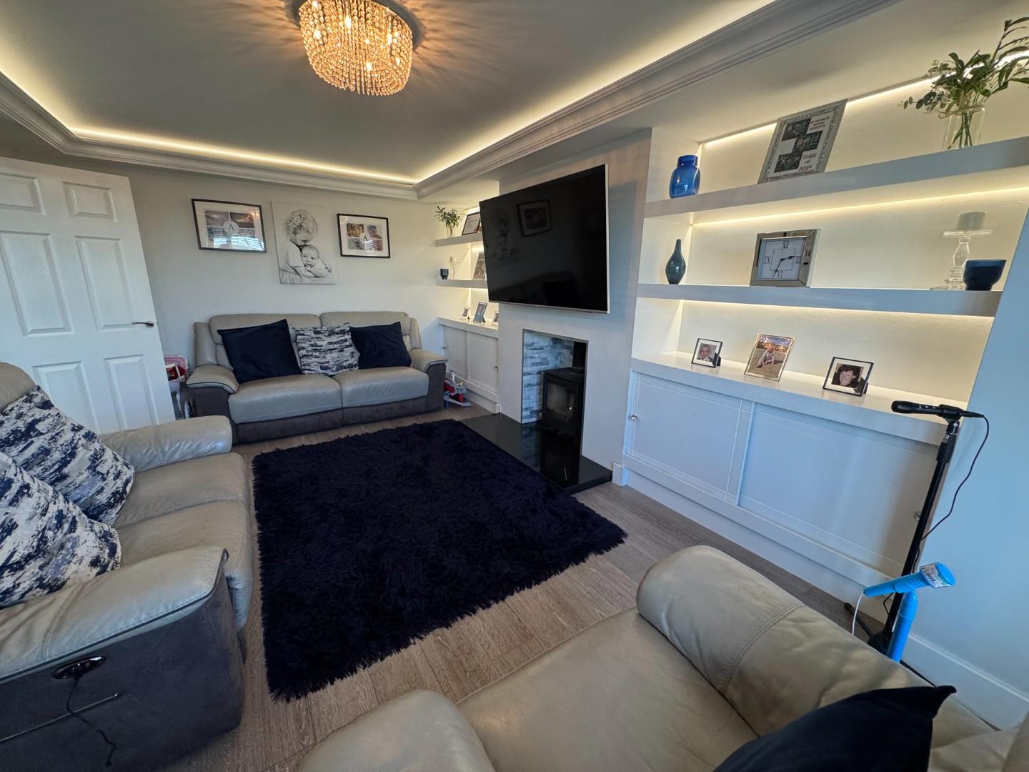 Bright spacious room with laminate flooring, Bay window, solid fuel stove wit granite hearth and tiled inlay, shelving with lights and ceiling pelmet with invisible lighting.