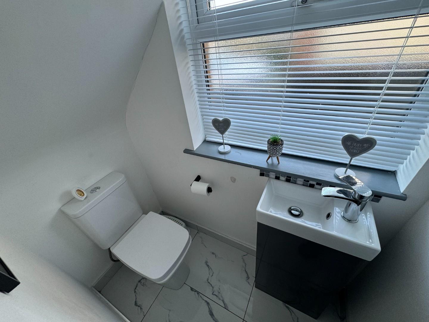 Downstairs toilet with tiled floor, LFWC and wall mounted wash hand basin.