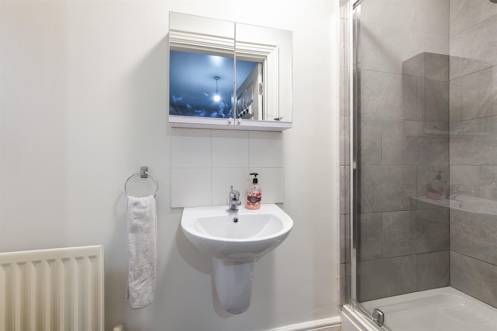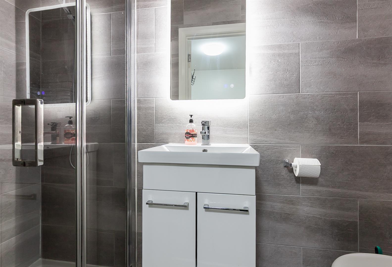 Modern white bathroom suite comprising walk-in drench shower, vanity unit, low flush wc, fully tiled walls, ceramic tiled floor, extractor fan.
