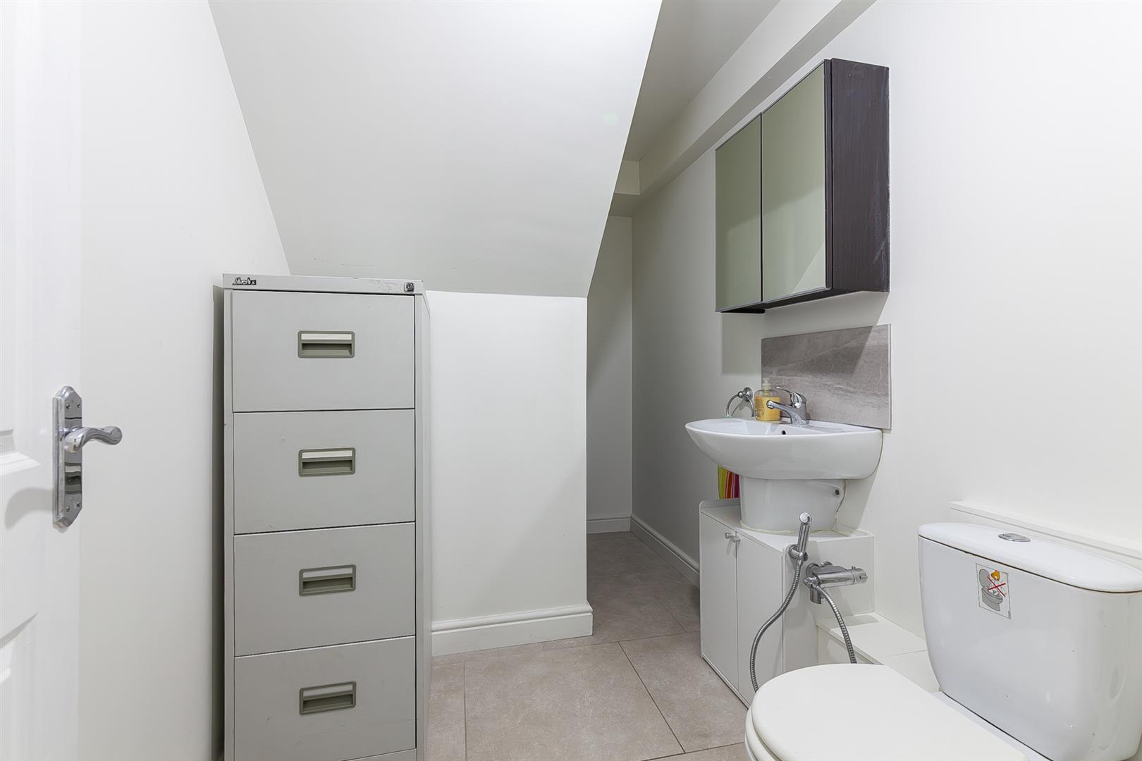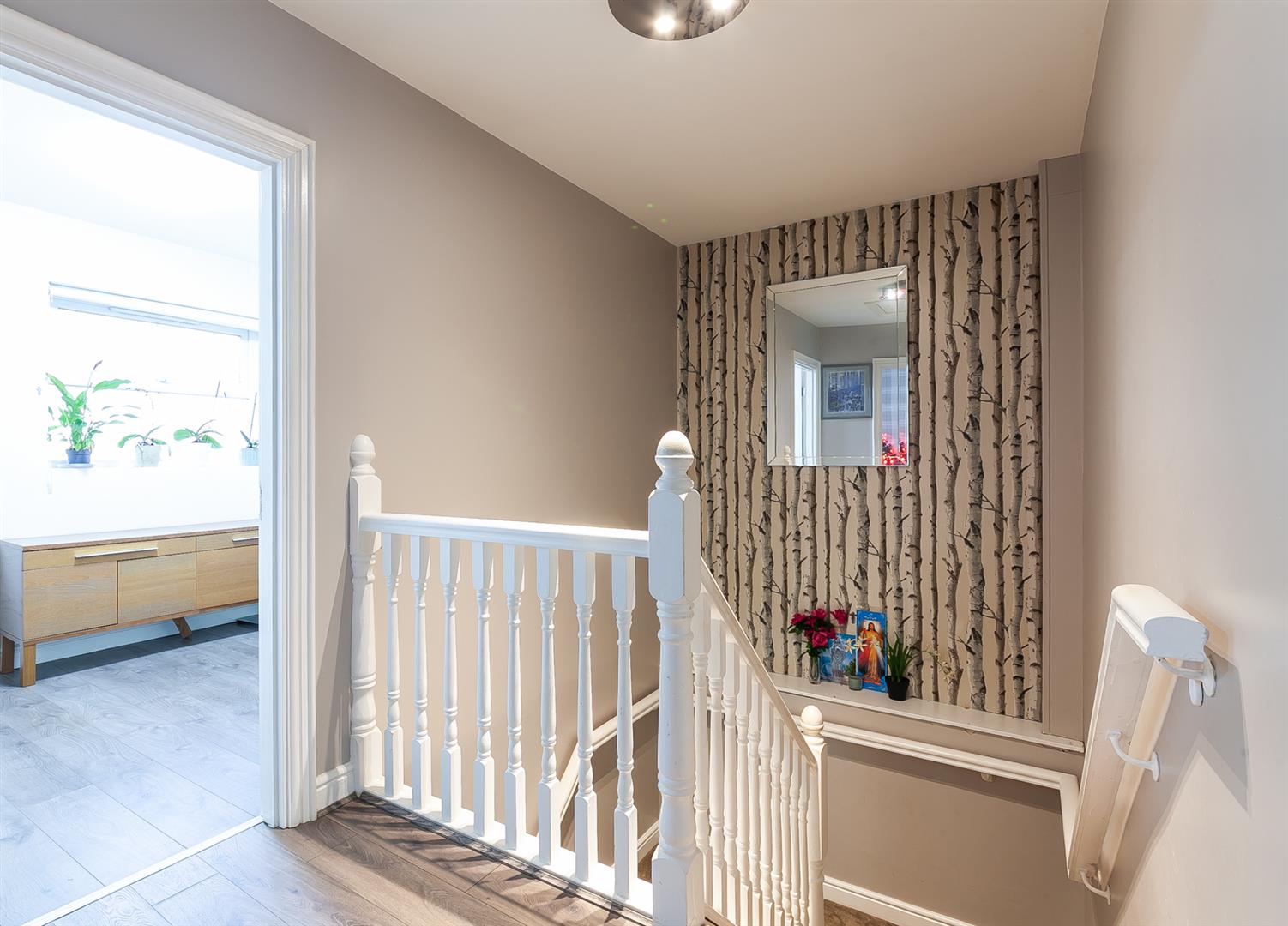 Landing, wood laminate floor, understairs storage with low flush wc and vanity unit.