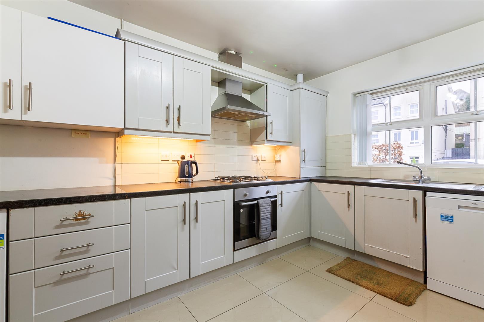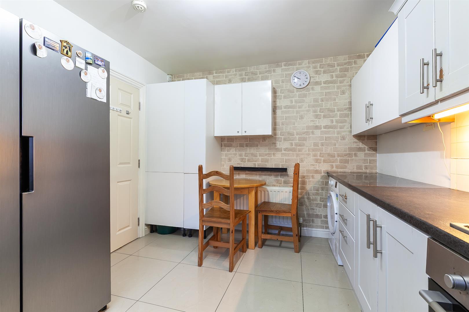 Stainless steel sink unit, extensive range of high and low level units, formica worktops, built-in under oven and gas hob, stainless steel canopy extractor fan, fridge/freezer space, plumbed for washing machine, tumble dryer space, larder cupboard, partly tiled walls, ceramic tiled floor.
