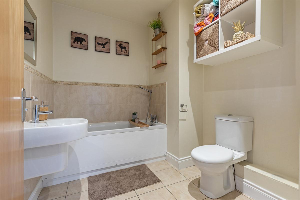 Three piece suite including; panel path with mixer taps and hand shower, wash hand basin, and low flush W.C. Extractor fan, ceiling spotlights, part tiled walls and tiled floor.
