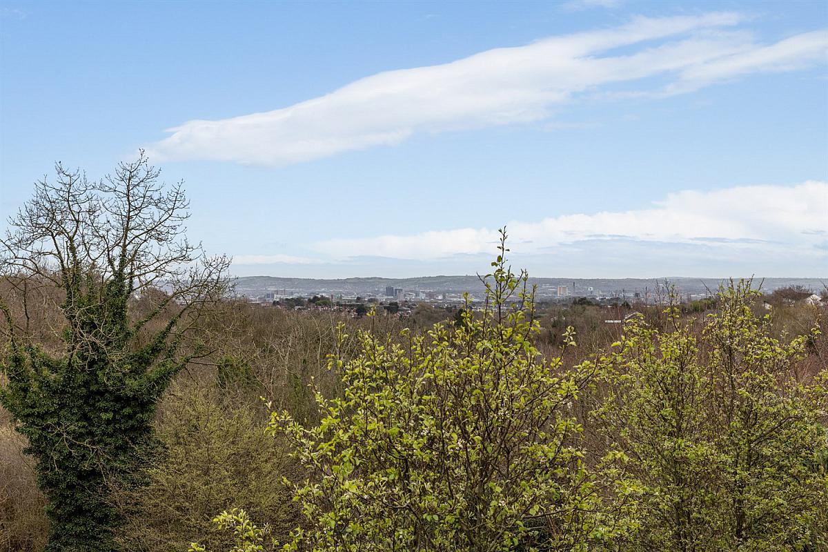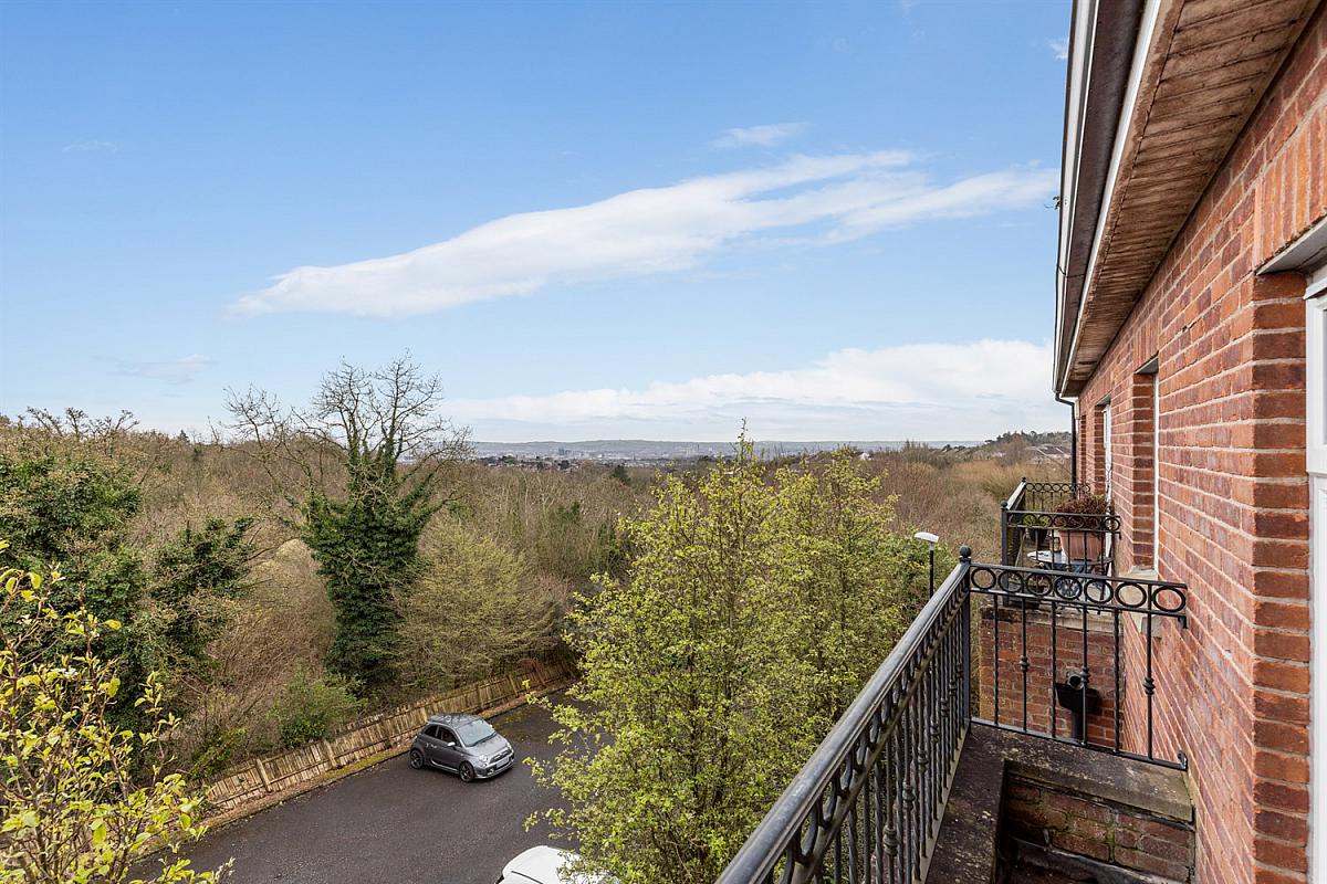 Private balcony with stunning panoramic views. Communal garden area in lawn, paved patio sitting area, surrounding trees and shrubs.