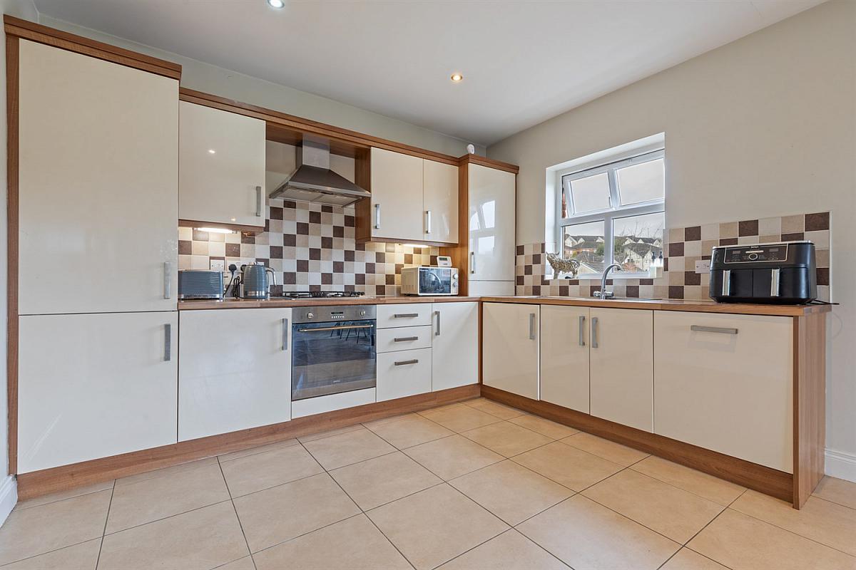 Full range of high and low level gloss units with wood effect worktop surfaces, stainless steel sink unit with mixer taps, integrated 4 ring gas hob with stainless steel extractor fan, electric oven, integrated fridge/freezer, integrated dishwasher, 'Vaillant' gas fired boiler (approx. 2 years old), part tiled walls and tiled floor to kitchen. Herringbone wooden floor to living/dining area, and tiled floor to kitchen area.