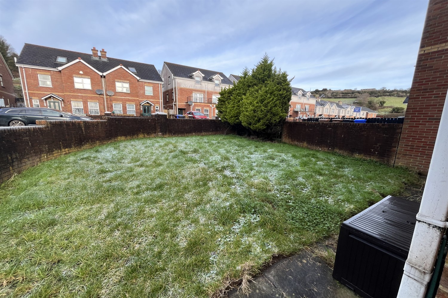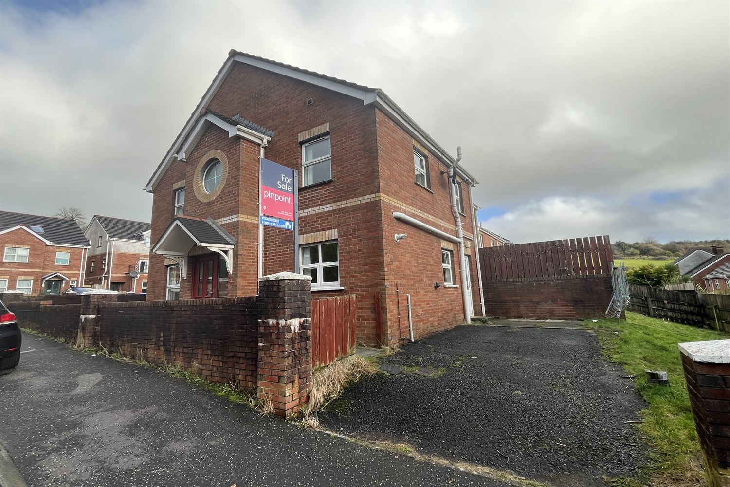Driveway to side, garden in lawn.