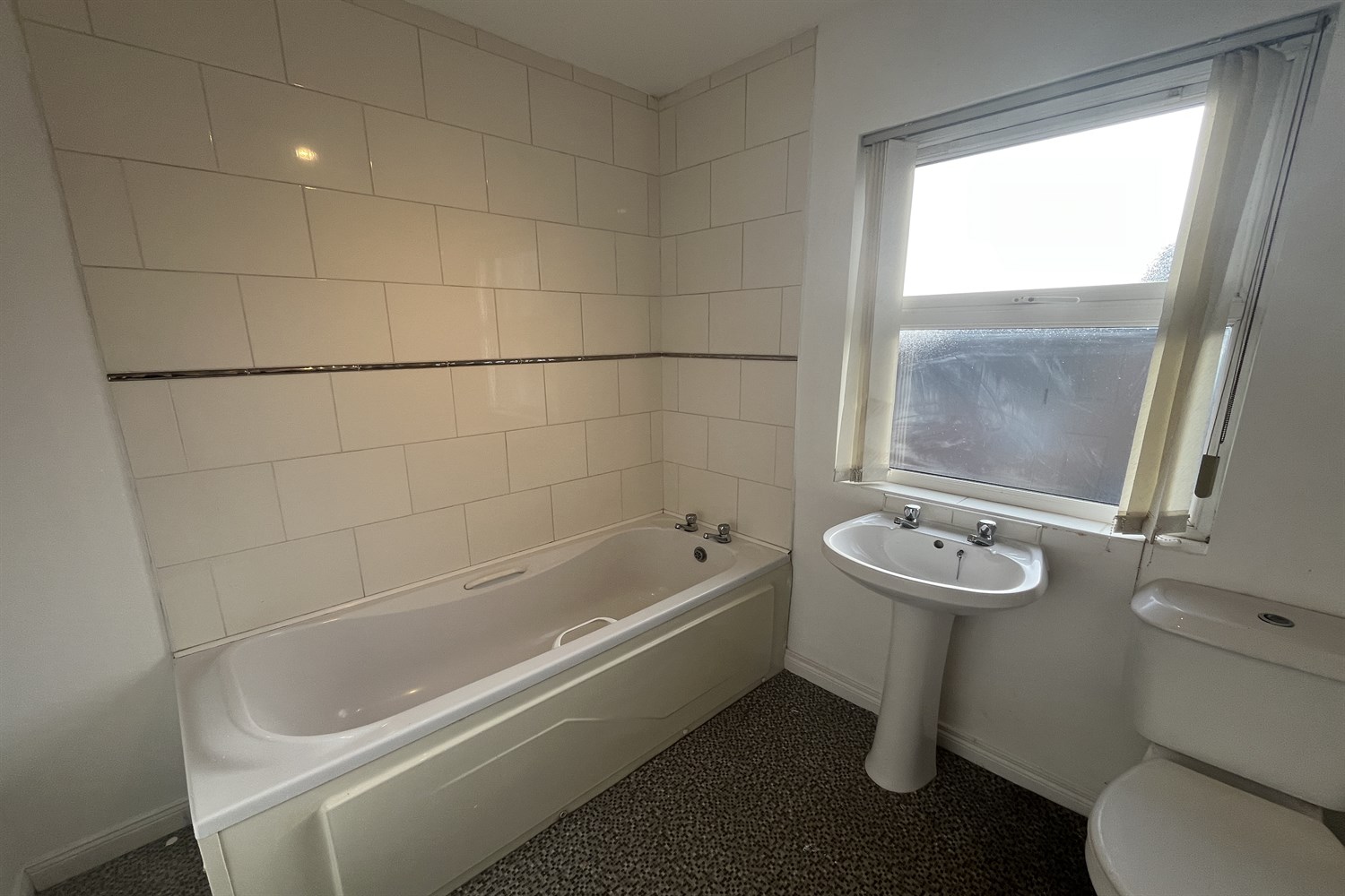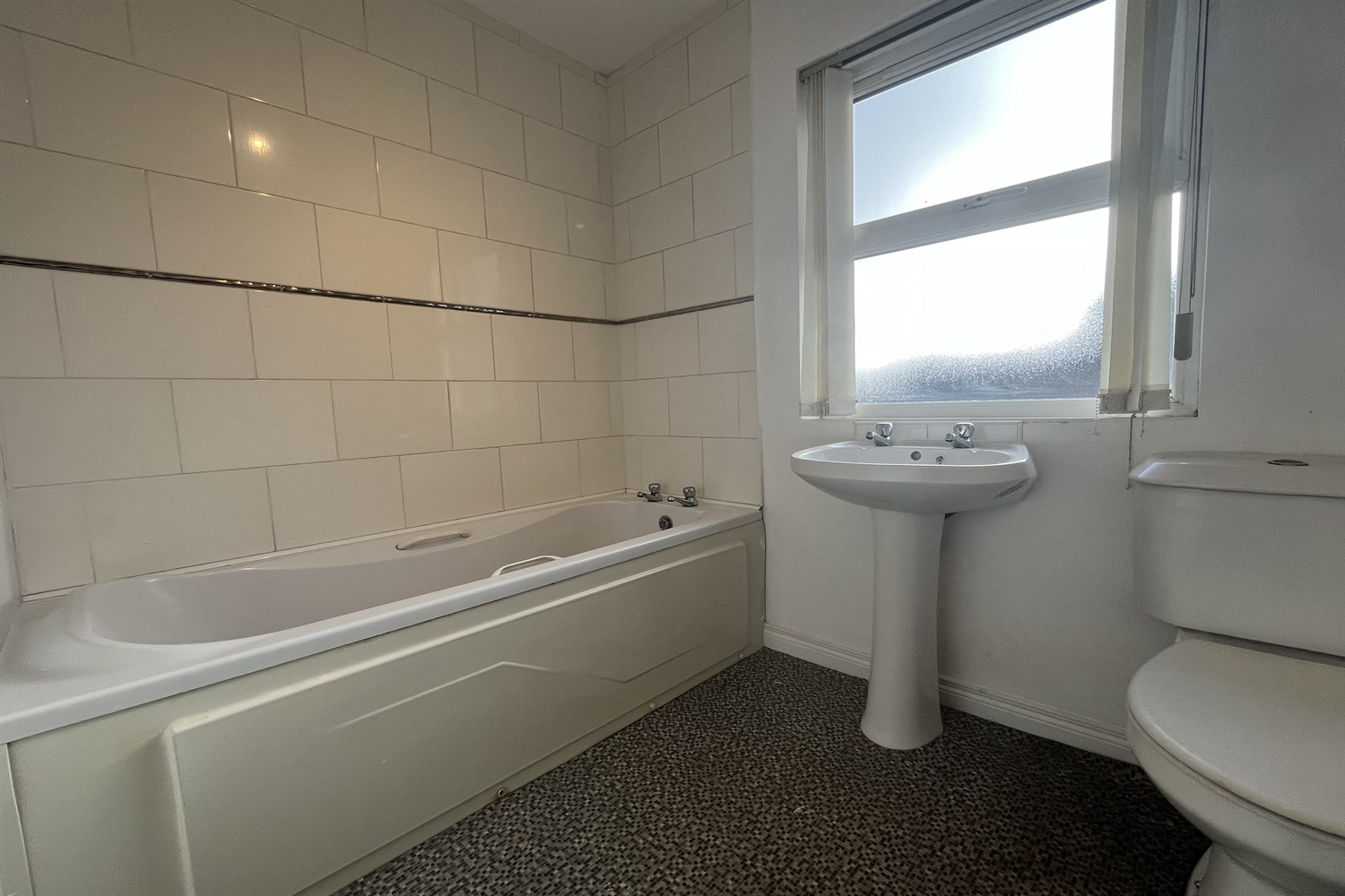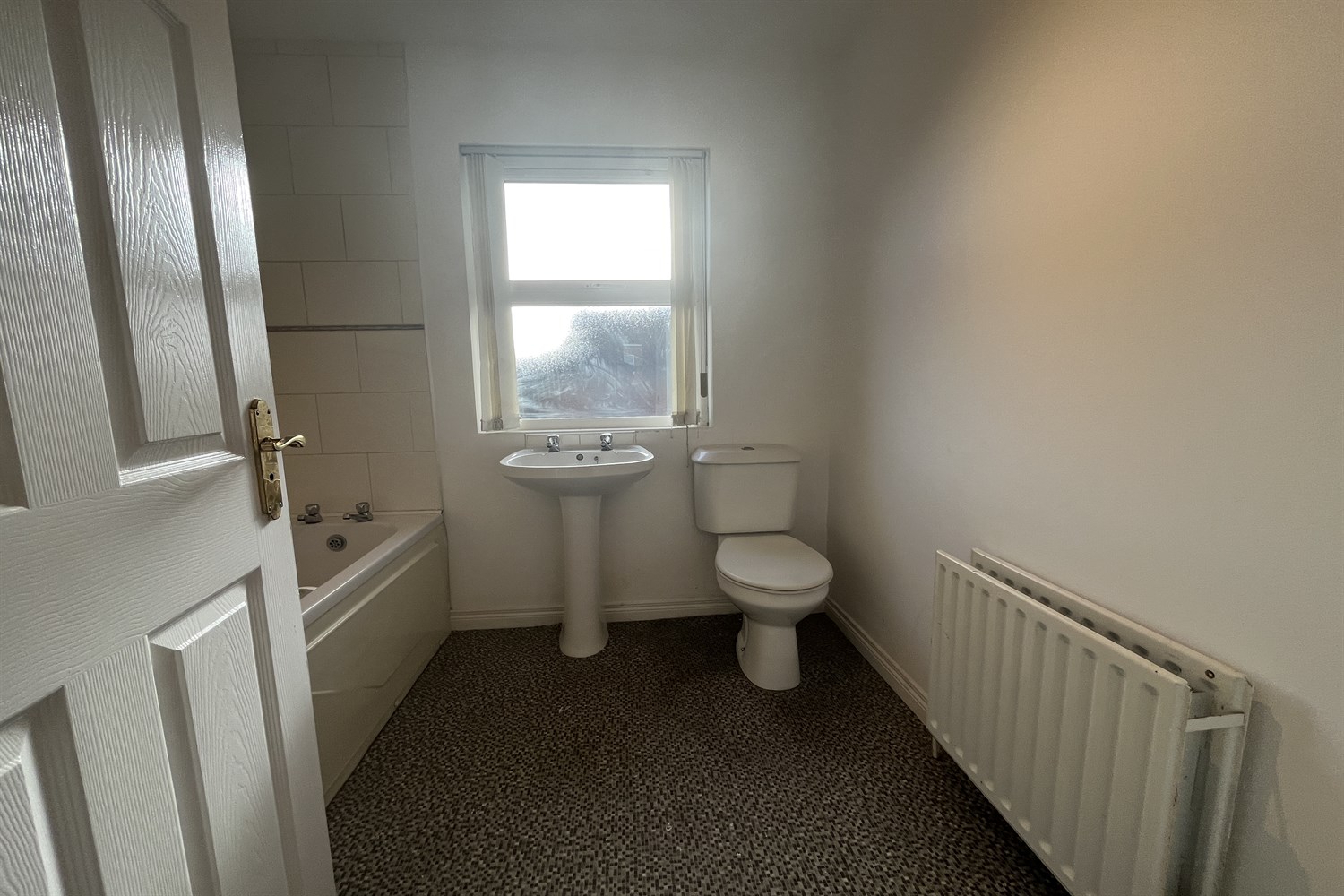 Partially tiled walls, double panelled radiator, white suite comprising, panelled bath, w.c.