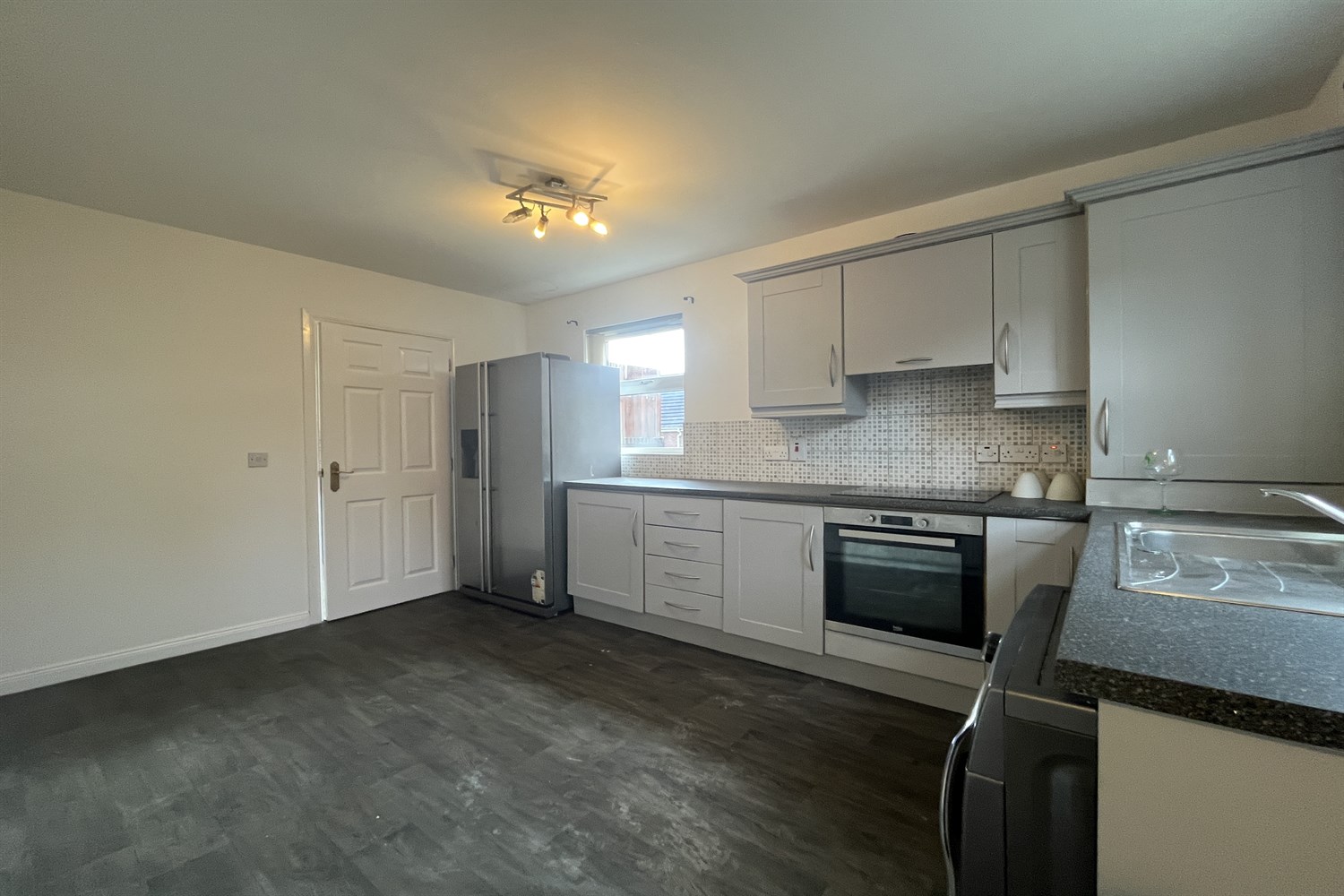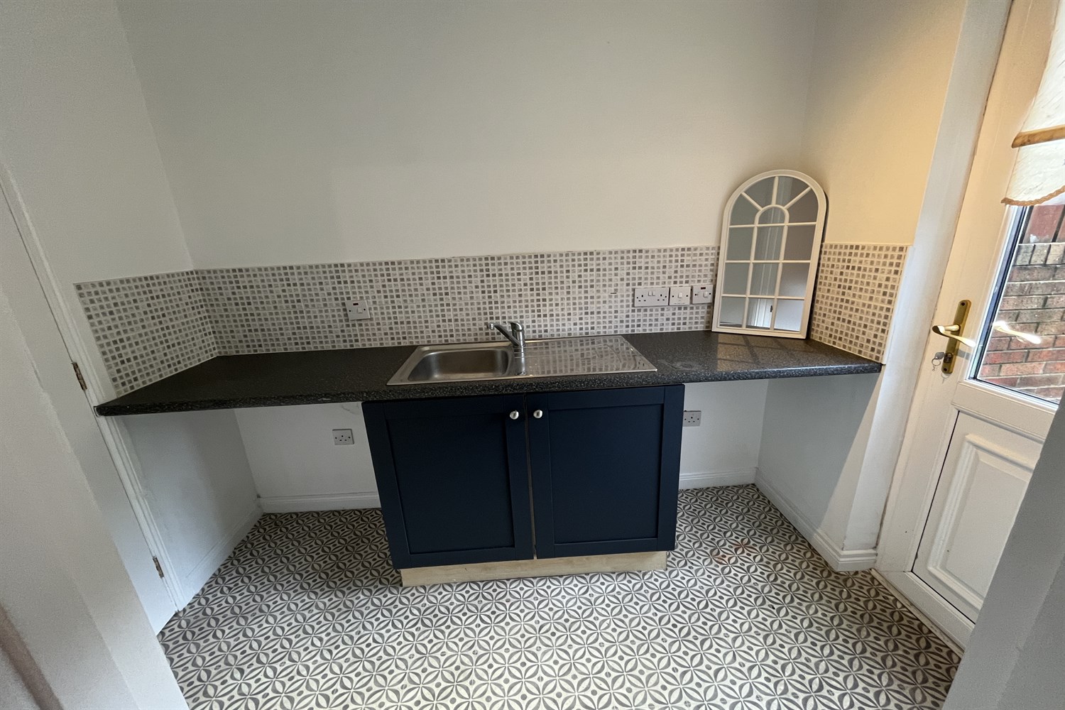 Single drainer stainless steel sink unit with mixer tap, low level unit, single panelled radiator, pvc door to side.