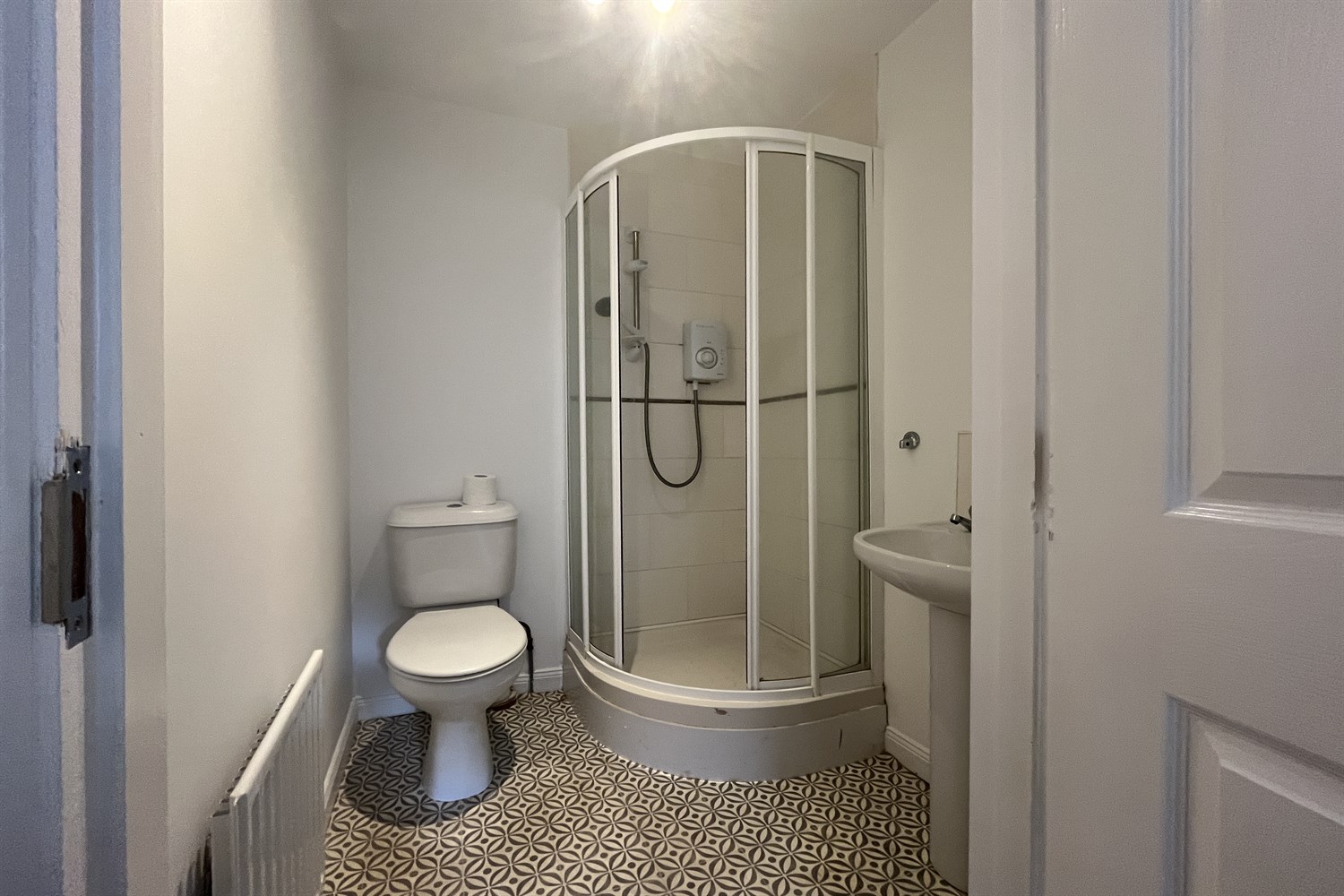Partially tiled walls, single panelled radiator, white suite comprising, w.c., pedestal wash hand basin, tiled shower cubicle with electric shower.