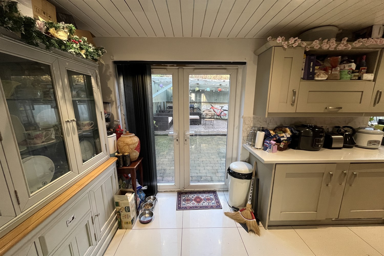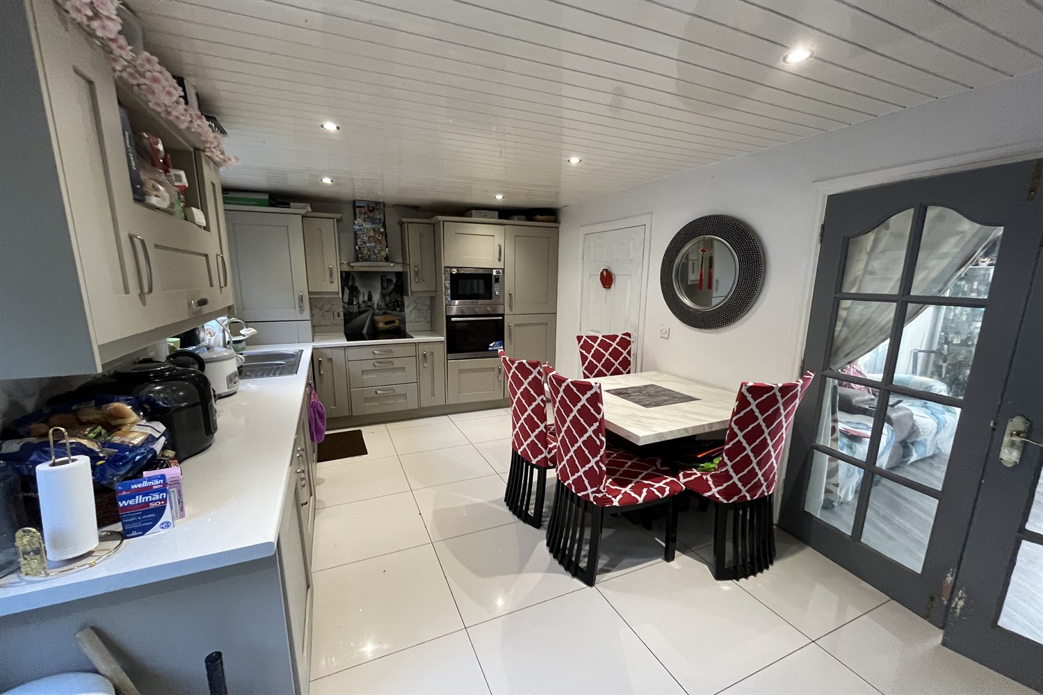 Ceramic tiled floor, single panelled radiator, 1 1/2 bowl stainless steel sink unit with mixer tap, range of high and low level shaker style units, electric hob with extractor fan over, integrated appliances including electric oven, microwave oven, fridge freezer, cupboard containing 'Idea;' gas boiler. Double doors to garden.