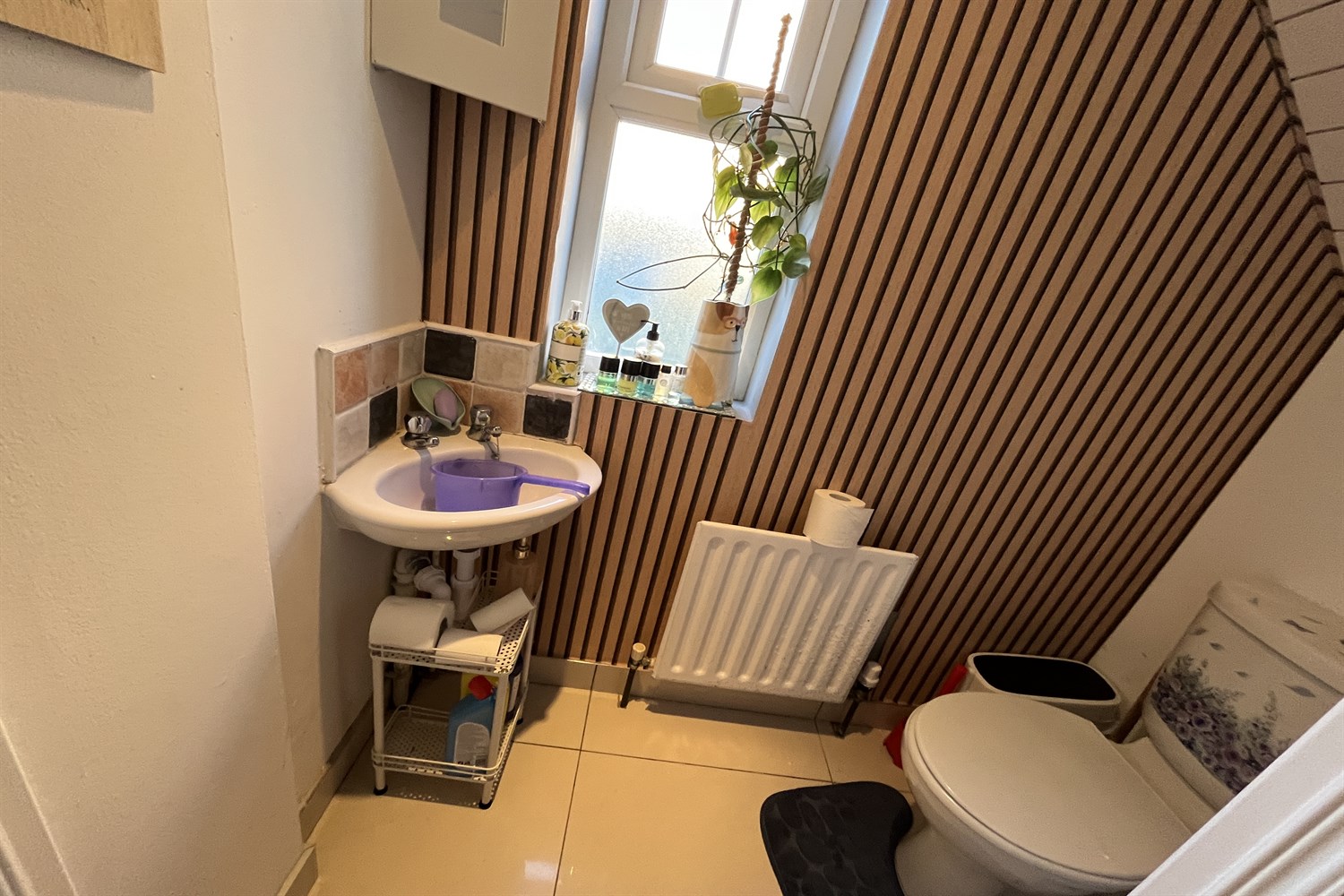 Ceramic tiled floor, pvc panelled ceiling, white suite comprising, wash hand basin, w.c, single panelled radiator.