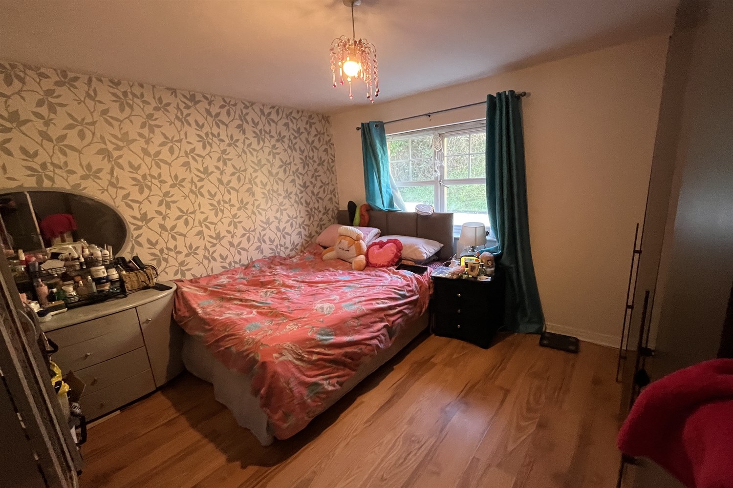 Laminated timber flooring, single panelled radiator, built in storage.