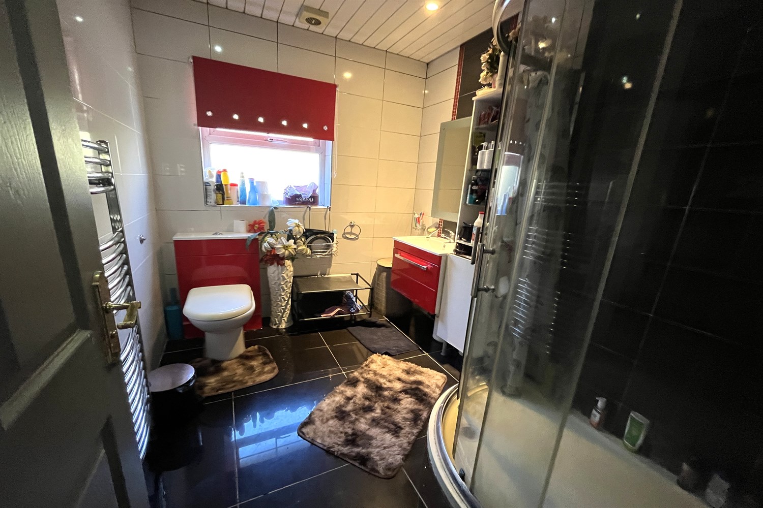 Ceramic tiled flooring, chrome ladder radiator, tiled walls, white and red suite comprising w.c., vanity unit with mixer tap, corner shower cubicle with thermostatically controlled dual head shower, pvc panelled ceiling.