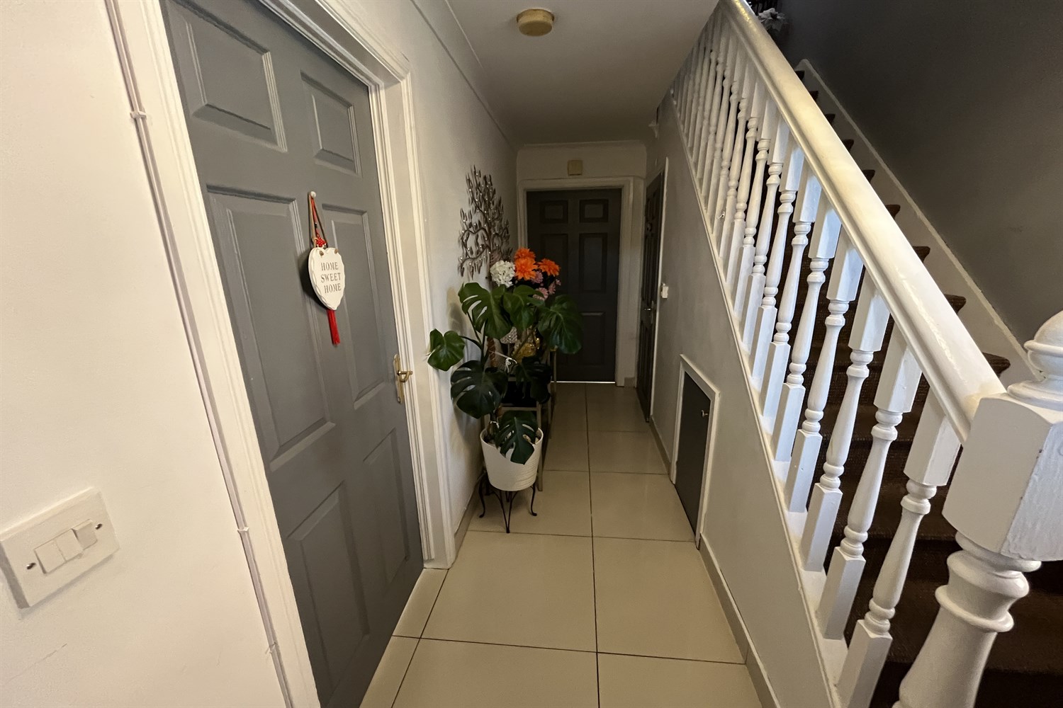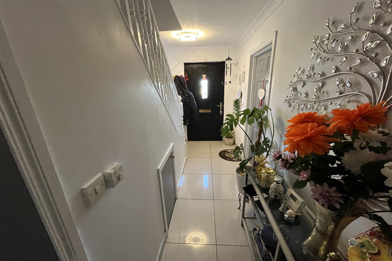 Entrance hall: Ceramic tiled floor, single panelled radiator, understairs storage.