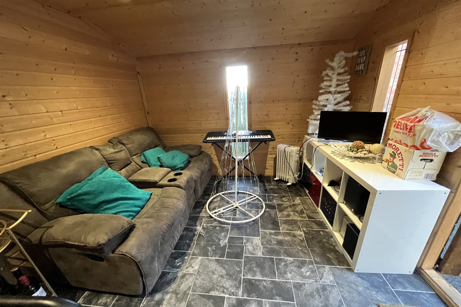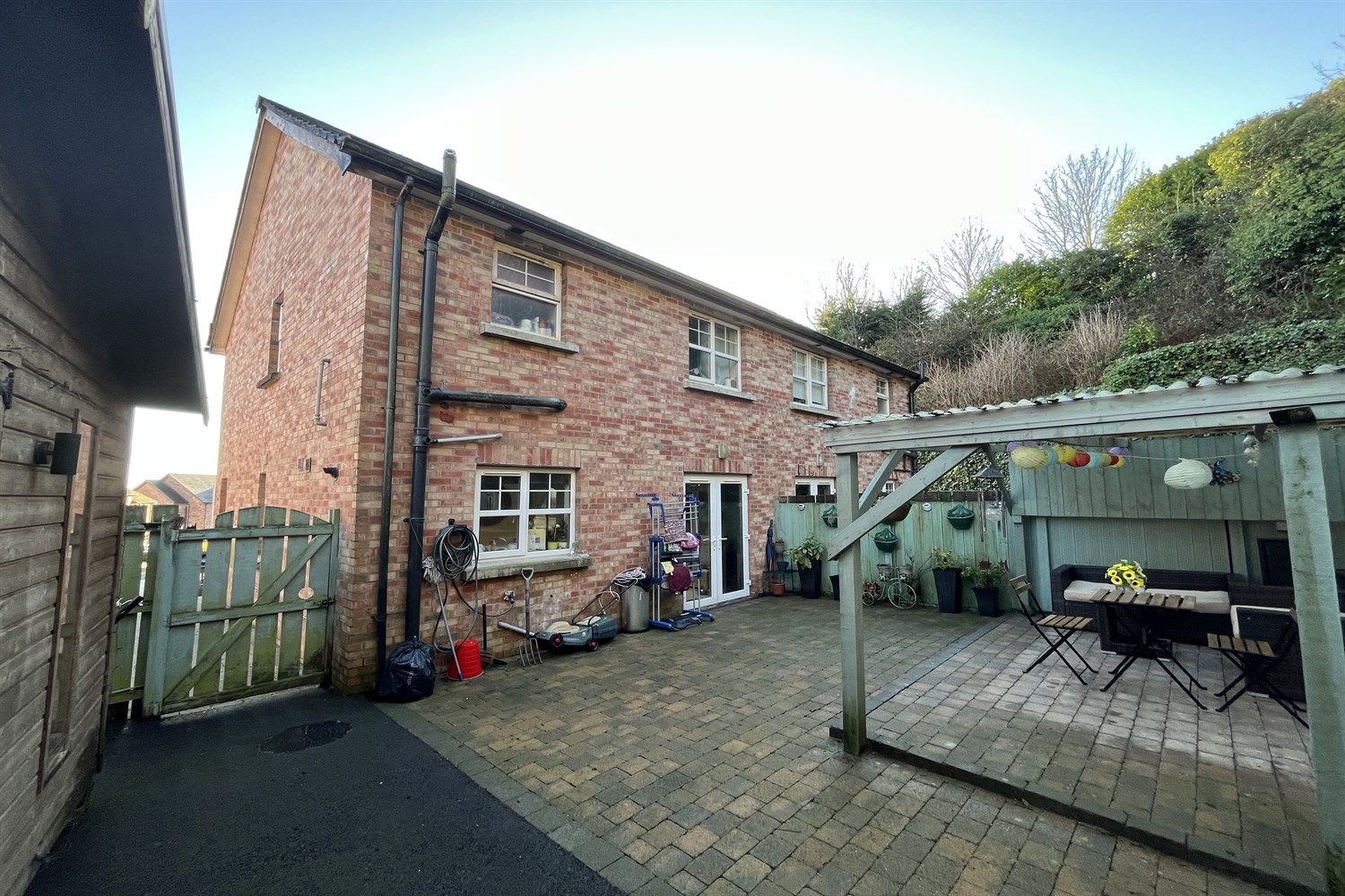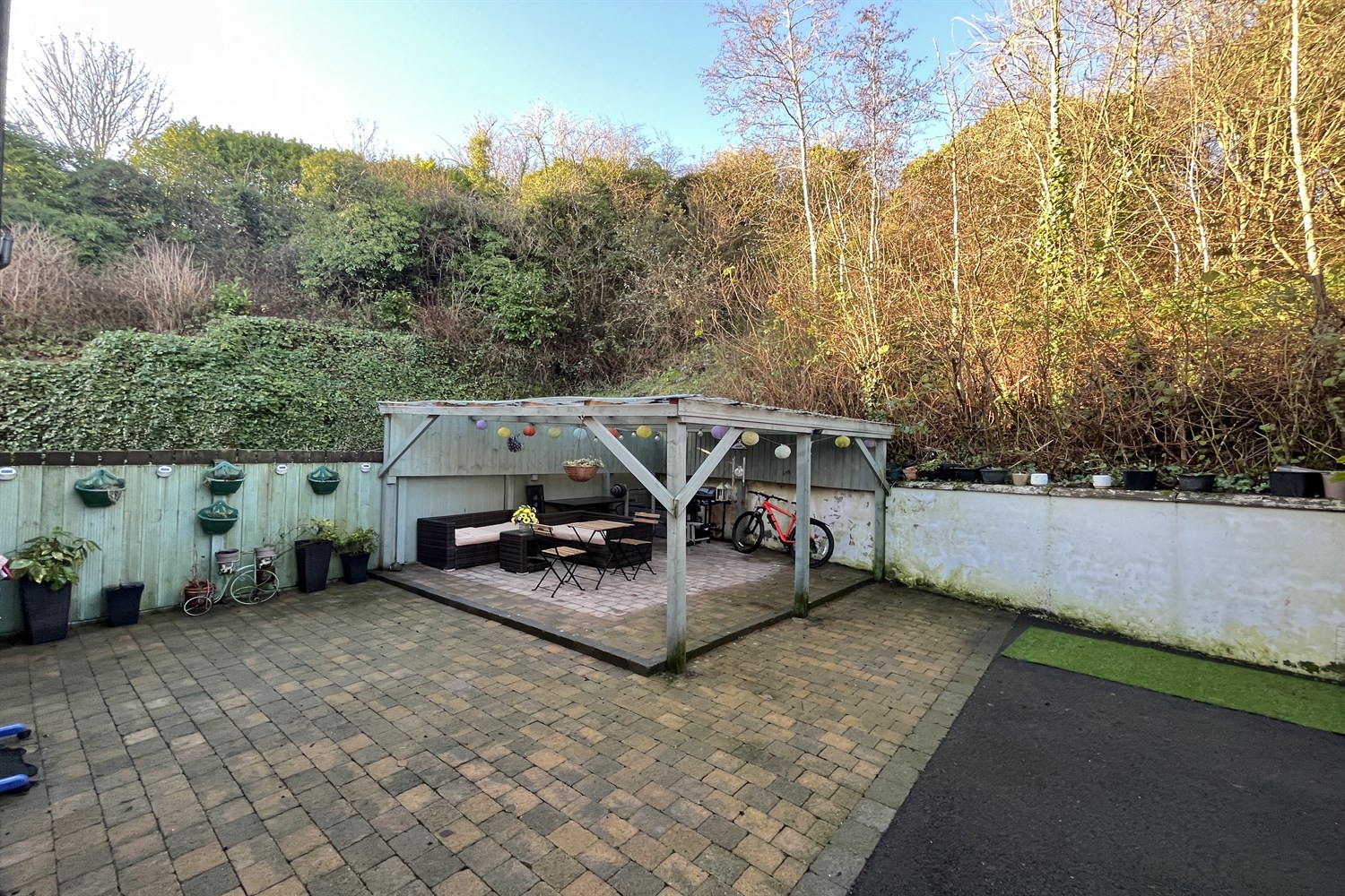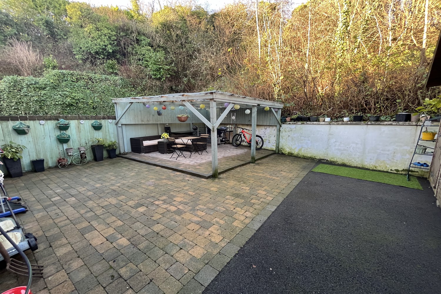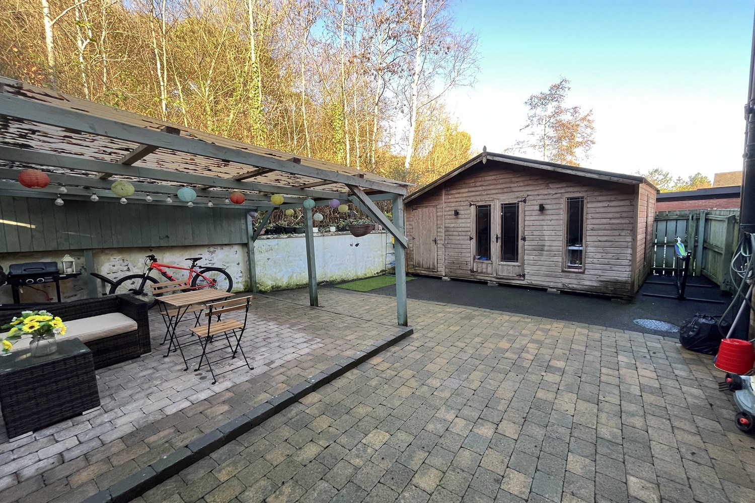 Rear: Paved garden, outside tap, light. Large external room with power and lighting.