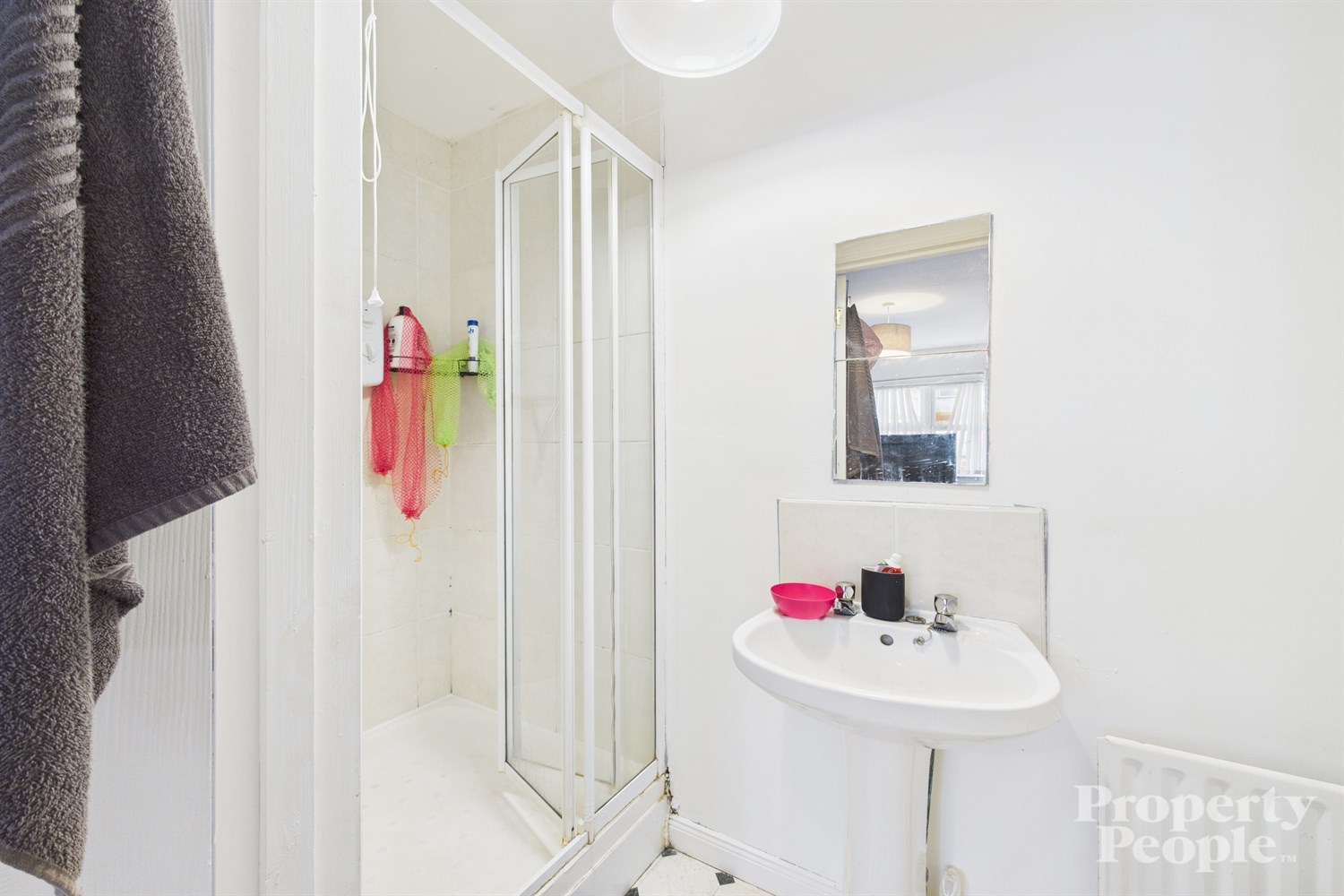 Three piece en-suite showroom comprising an enclosed shower cubicle with electric shower, wash hand basin with pedestal and low flush WC. Partly tiled walls, lino floor with tile effect, extractor fan and single panel radiator.