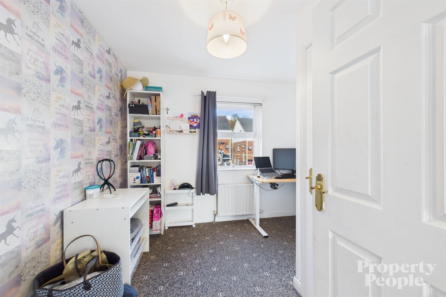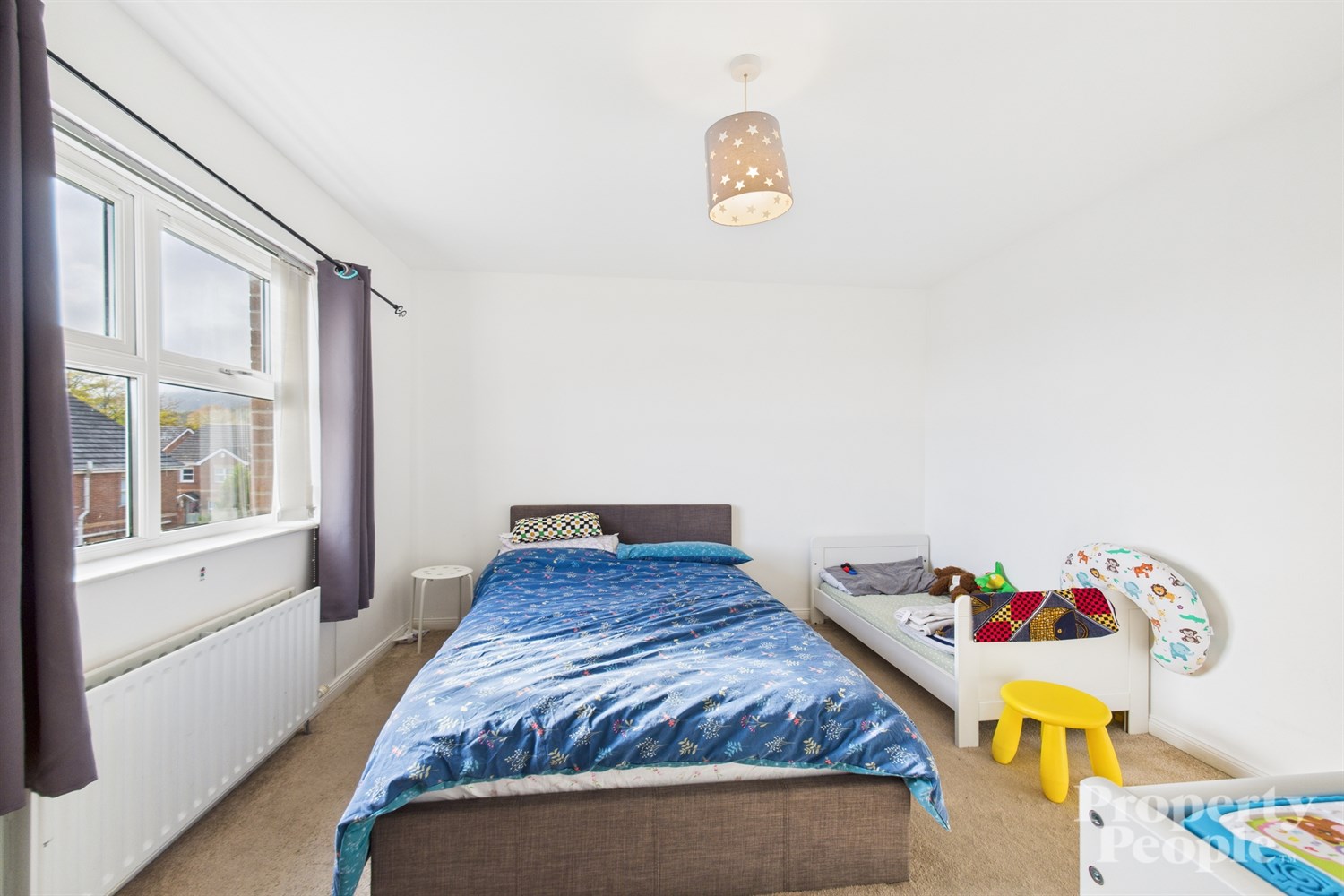 A bright and spacious double bedroom with view over rear gardens, carpet flooring and double panel radiator.