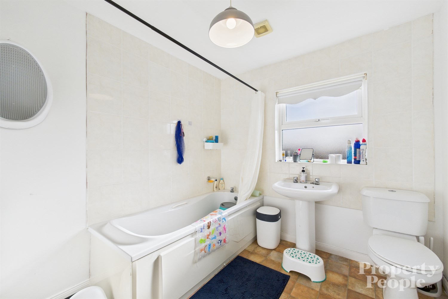 A three piece family bathroom suite comprising a low flush WC, wash hand basin with pedestal and bath. Partly tiled walls and lino flooring with tile effect.