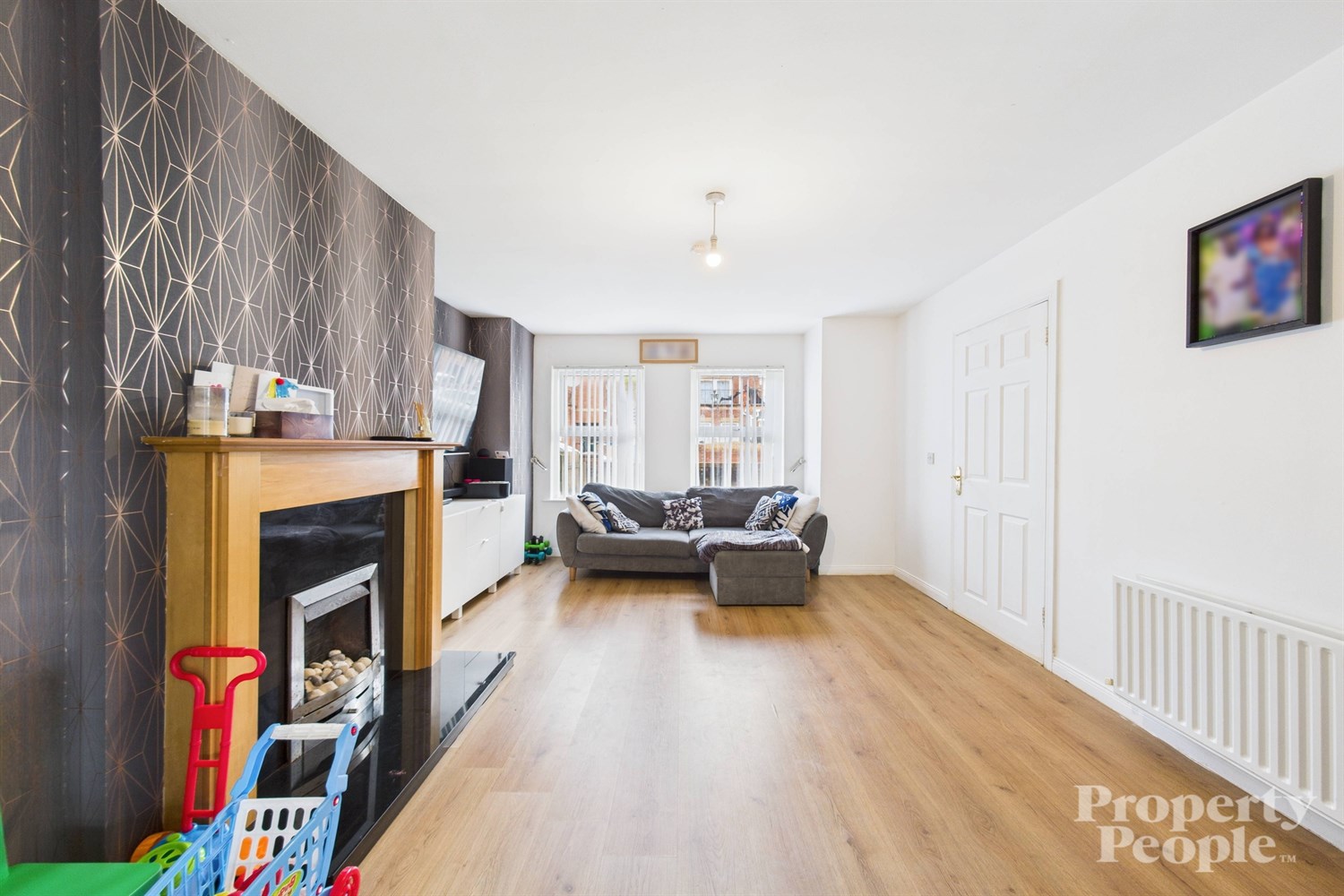 A bright and spacious living room with feature fireplace, double doors to dining space fantastic for entertaining with family and friends, laminate wooden floor and double panelled radiator.
