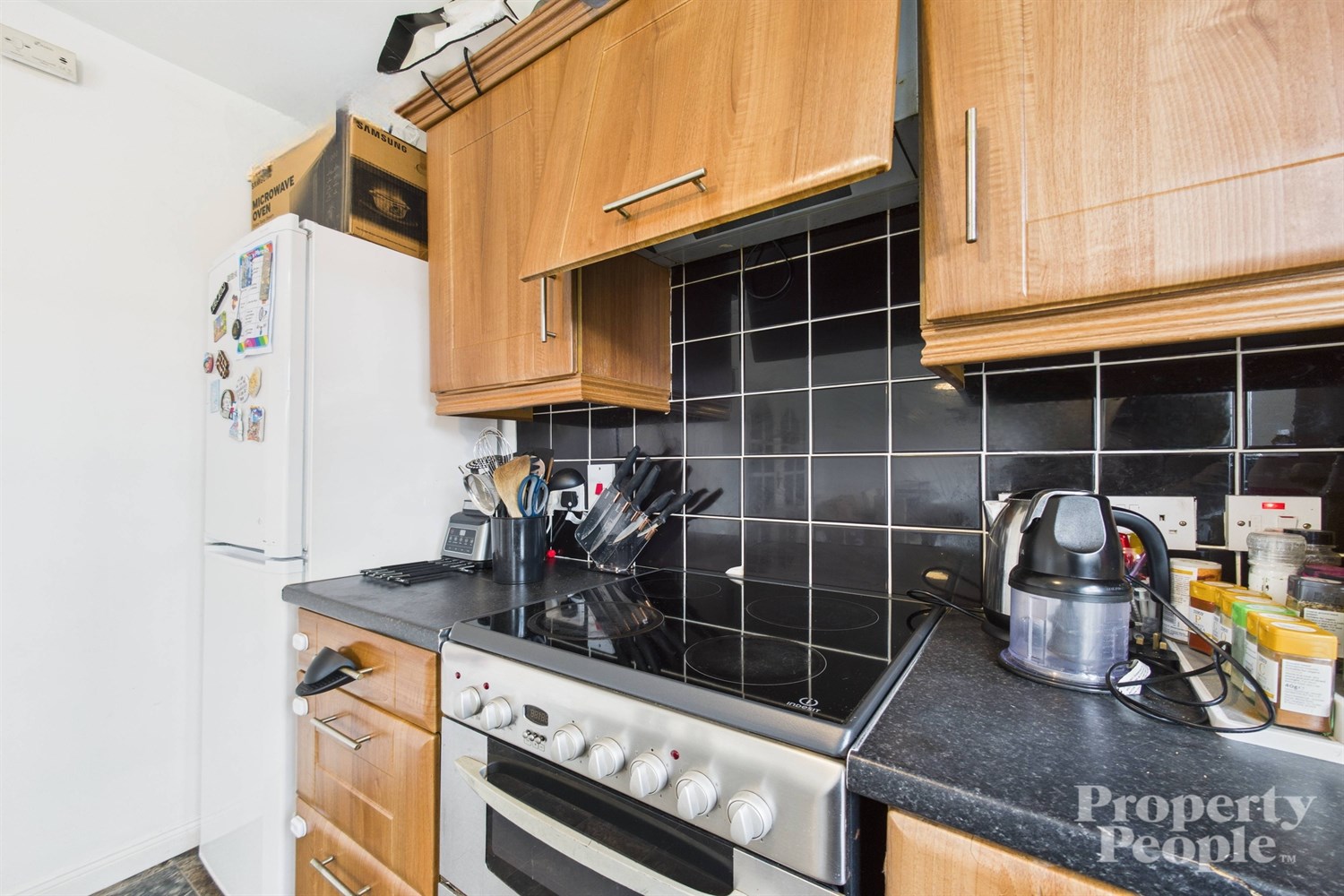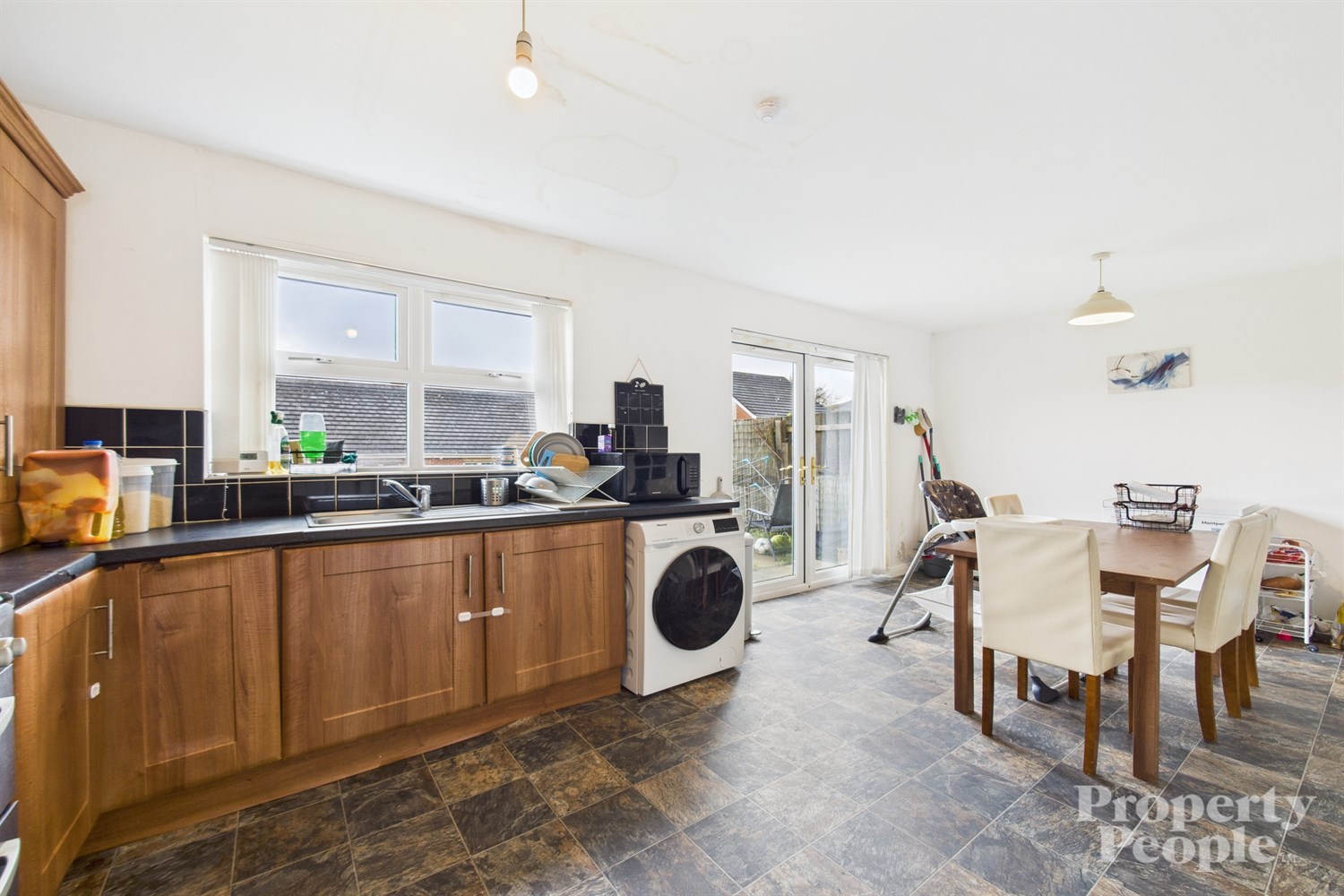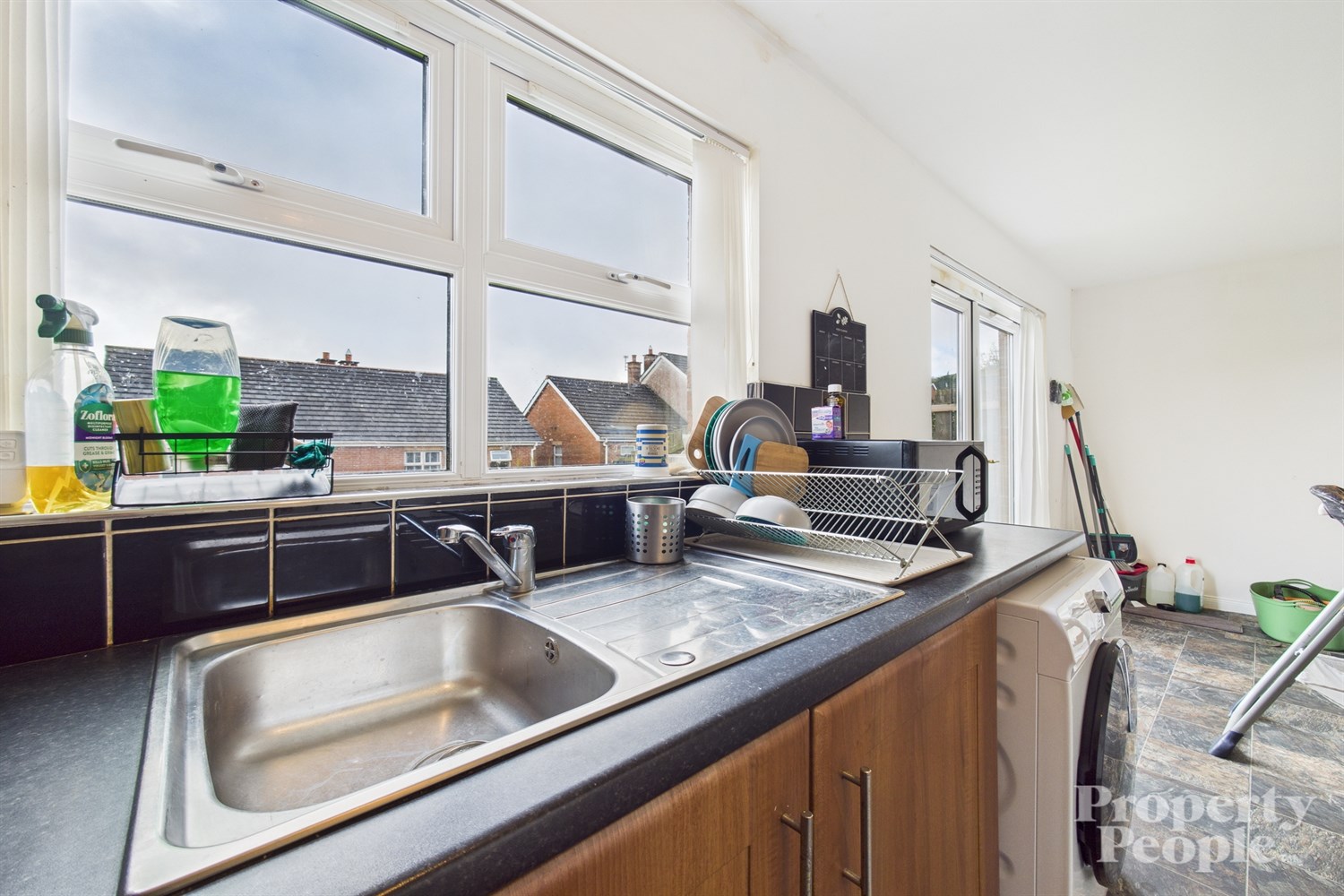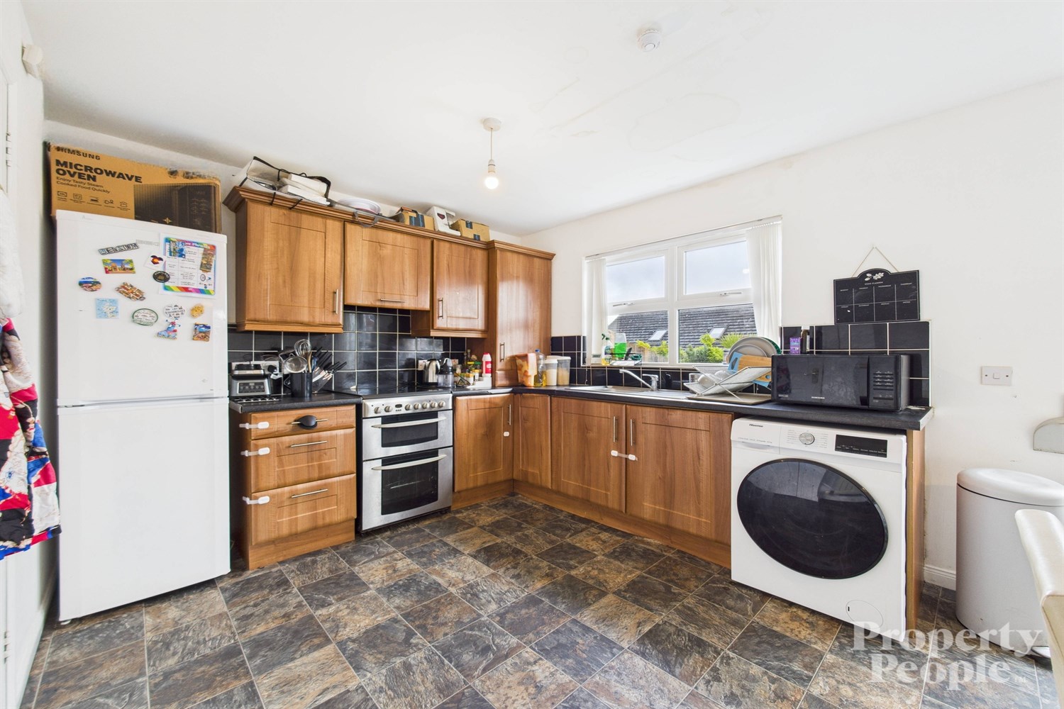 Fitted shaker style kitchen with a good range of high and low level units, integrated hob and oven with extractor fan over, space for freestanding fridge freezer and plumbed for washing machine. Splashback tiled walls with lino floor with tile effect.