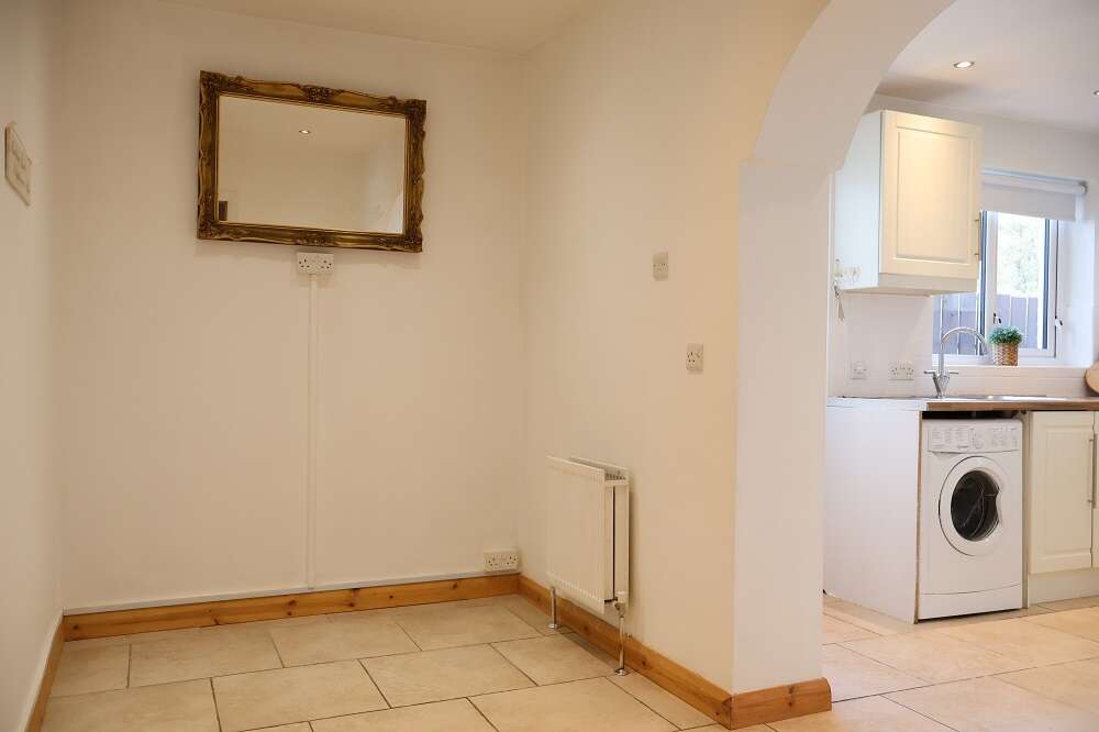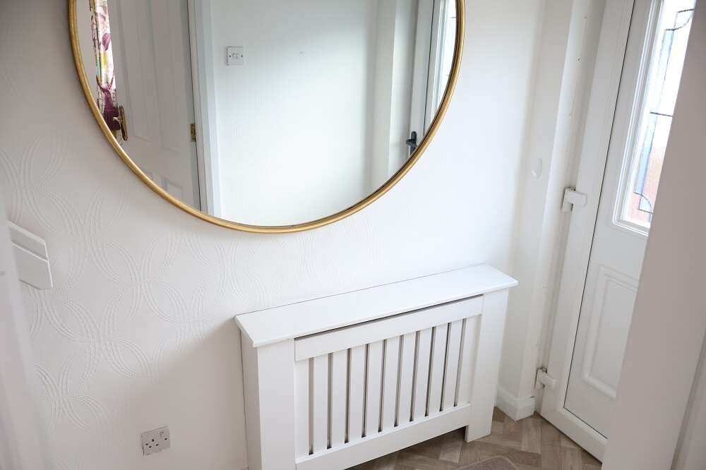 uPVC front door with double glazed centre light. Vinyl herringbone effect floor. Modern radiator cover. Carpet flooring to stairs.