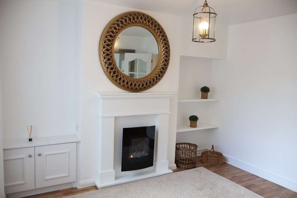 12'2 x 10'8 Contemporary fireplace housing wall mounted electric fire. Built in storage units and open shelving to sides. Natural Oak floor.