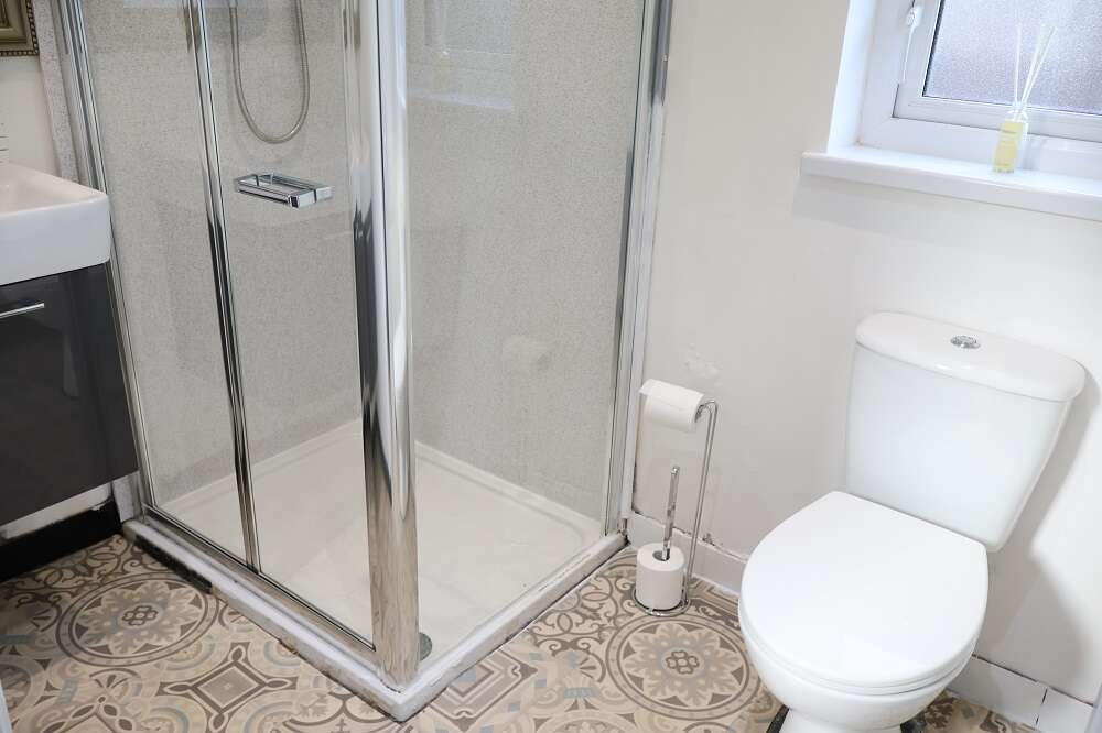 7'2 x 5'0 White, modern 3 piece suite comprising large walk-in shower unit with REDRING GLOW Electric shower. Floating vanity unit with wash hand basin and splashback tiling. Low flush w.c. Recessed lights to ceiling. Vinyl covering to shower area and Patterned vinyl floor covering.