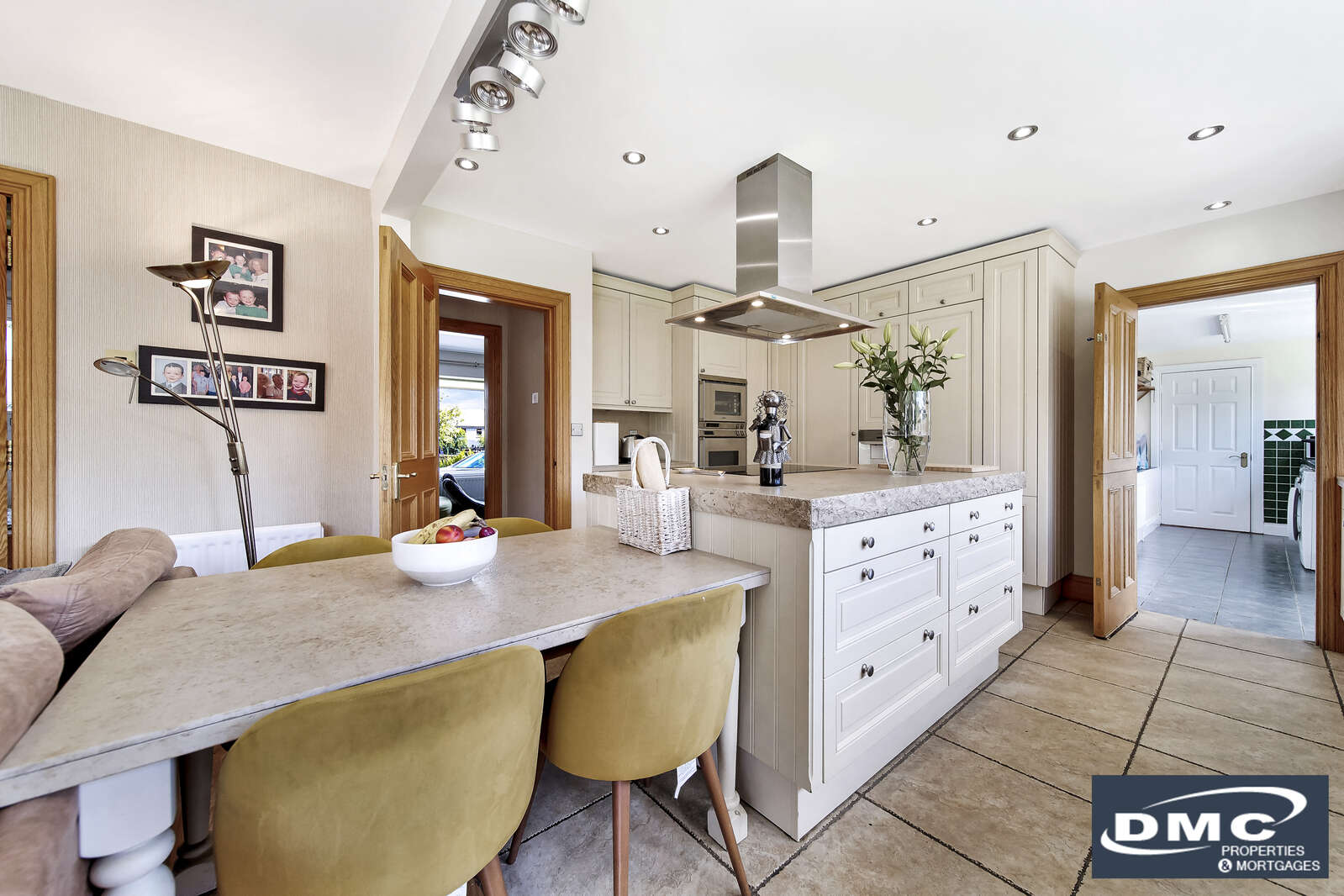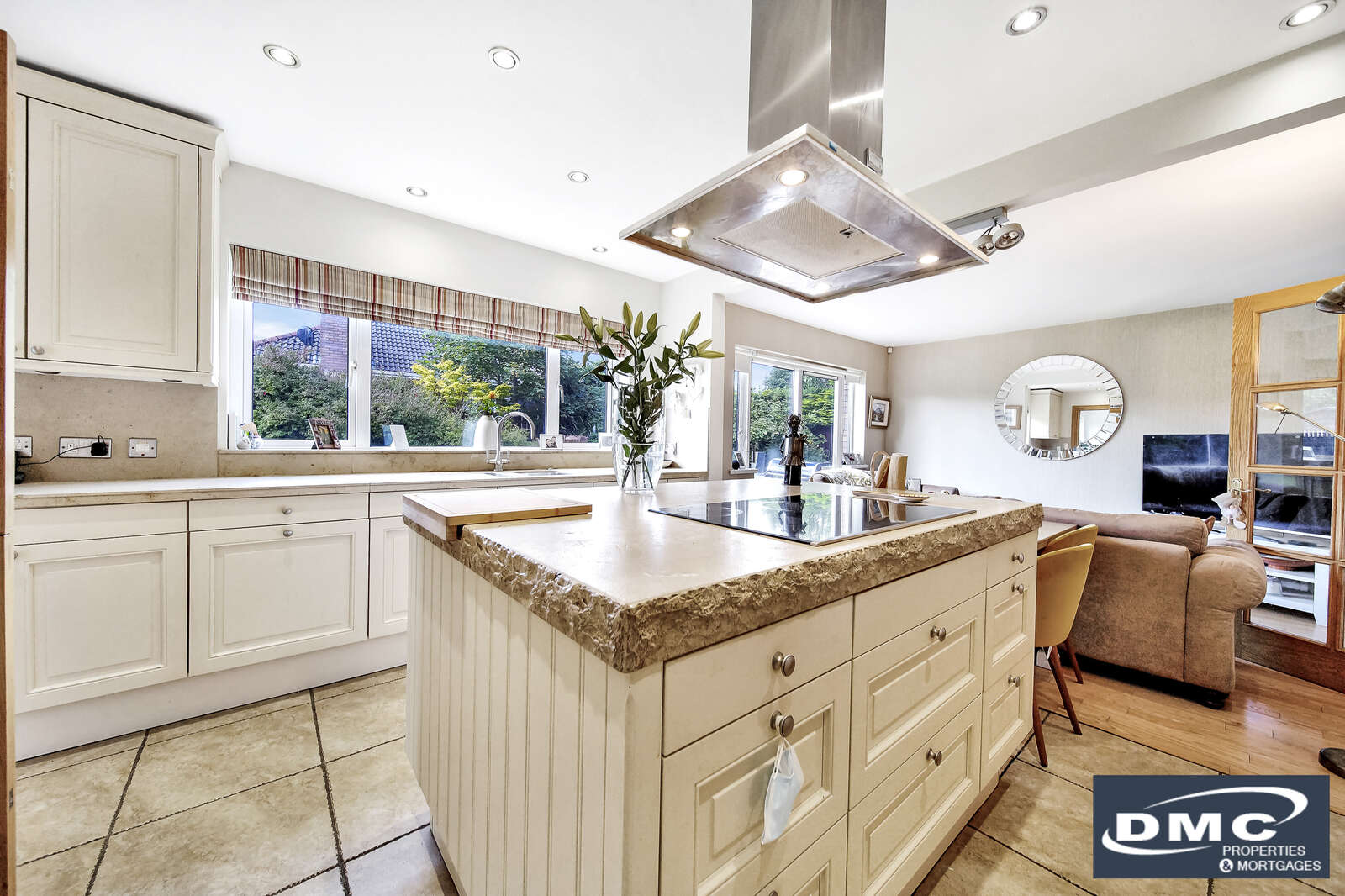 Kitchen Through Dining Area/Living Space :25'4 x 13'2 Superb range of bespoke units with polished limestone worktops and splashbacks, Stainless steel one and a half bowl sink unit with mixer taps. Tiled floor. Recessed lights to ceiling. Integral dishwasher and fridge and freezer. Double eyelevel oven and four ring ceramic hob with hotplate and canopy housing concealed extractor fan to feature centre island unit and breakfast bar.